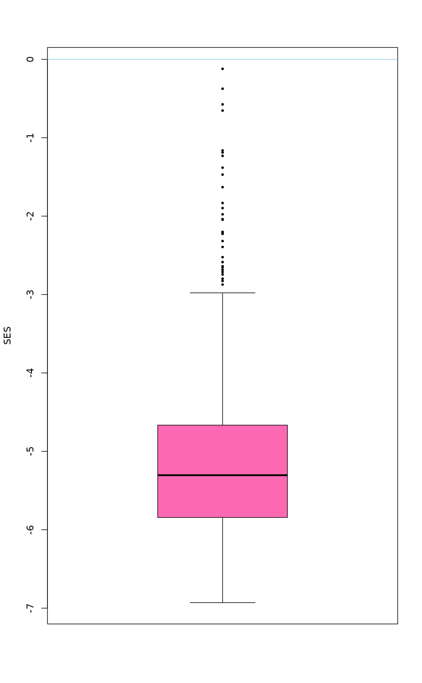 boxplot(perm, scale=TRUE, lty=1, pch=16, cex=0.6, col="hotpink", ylab="SES")