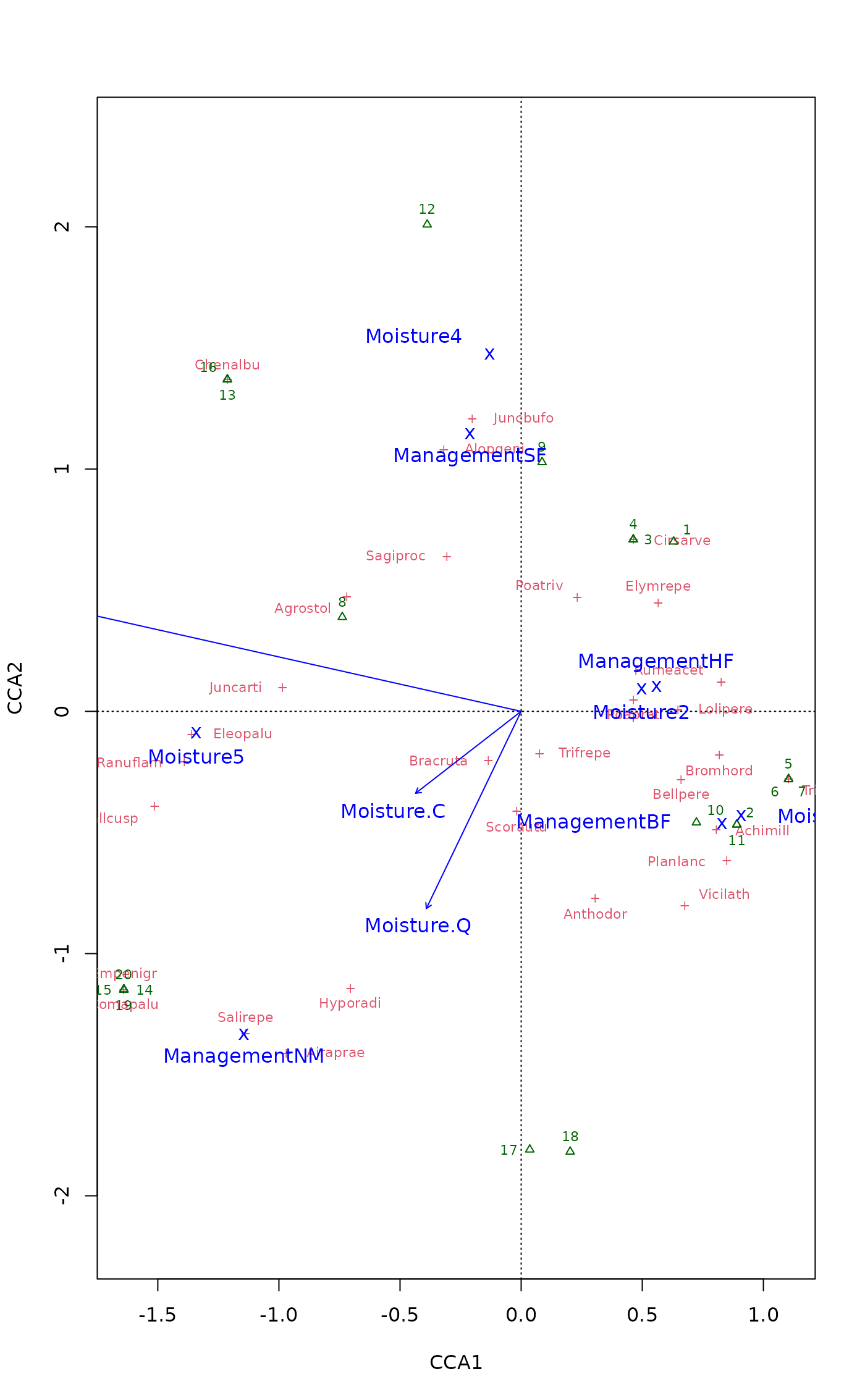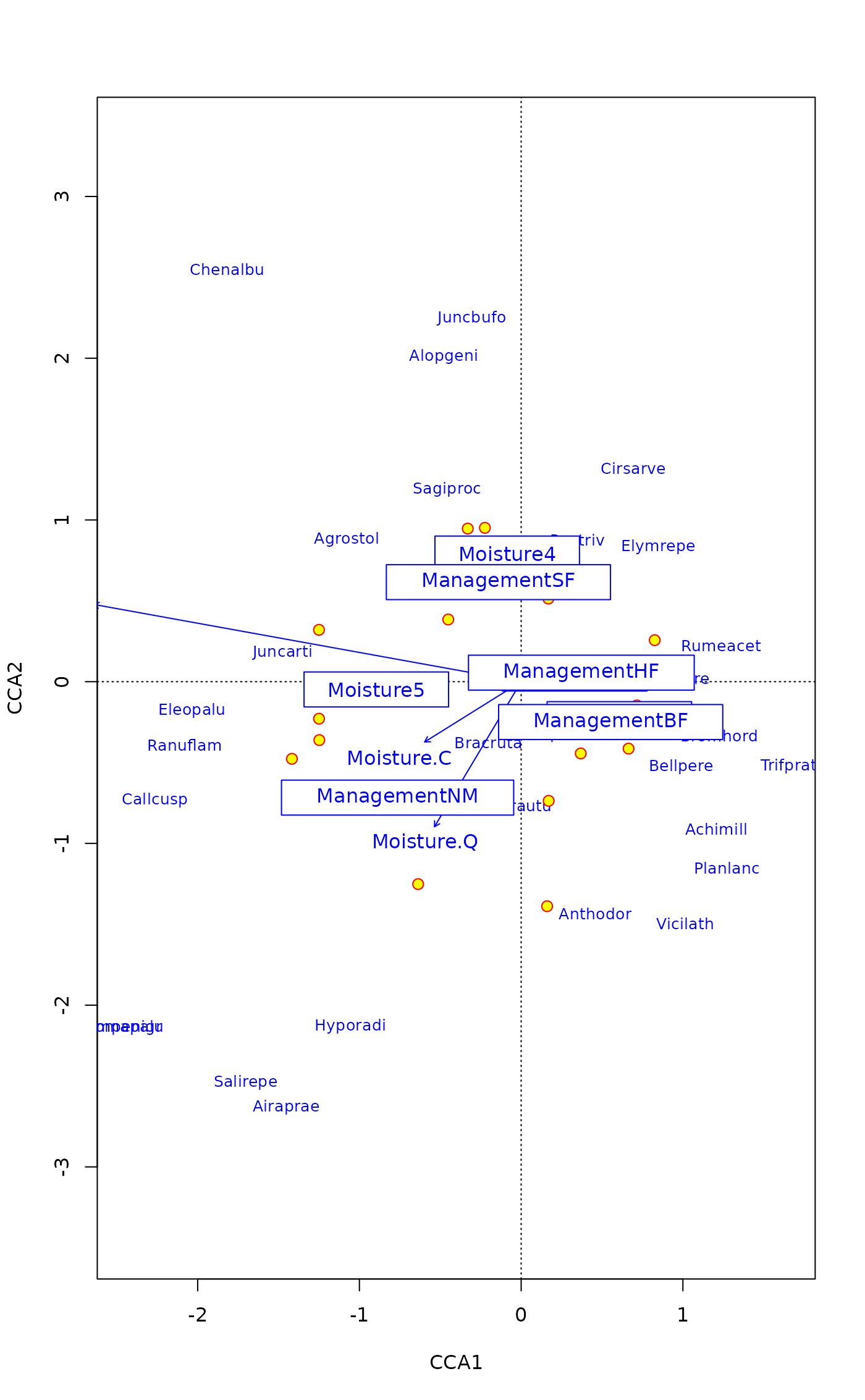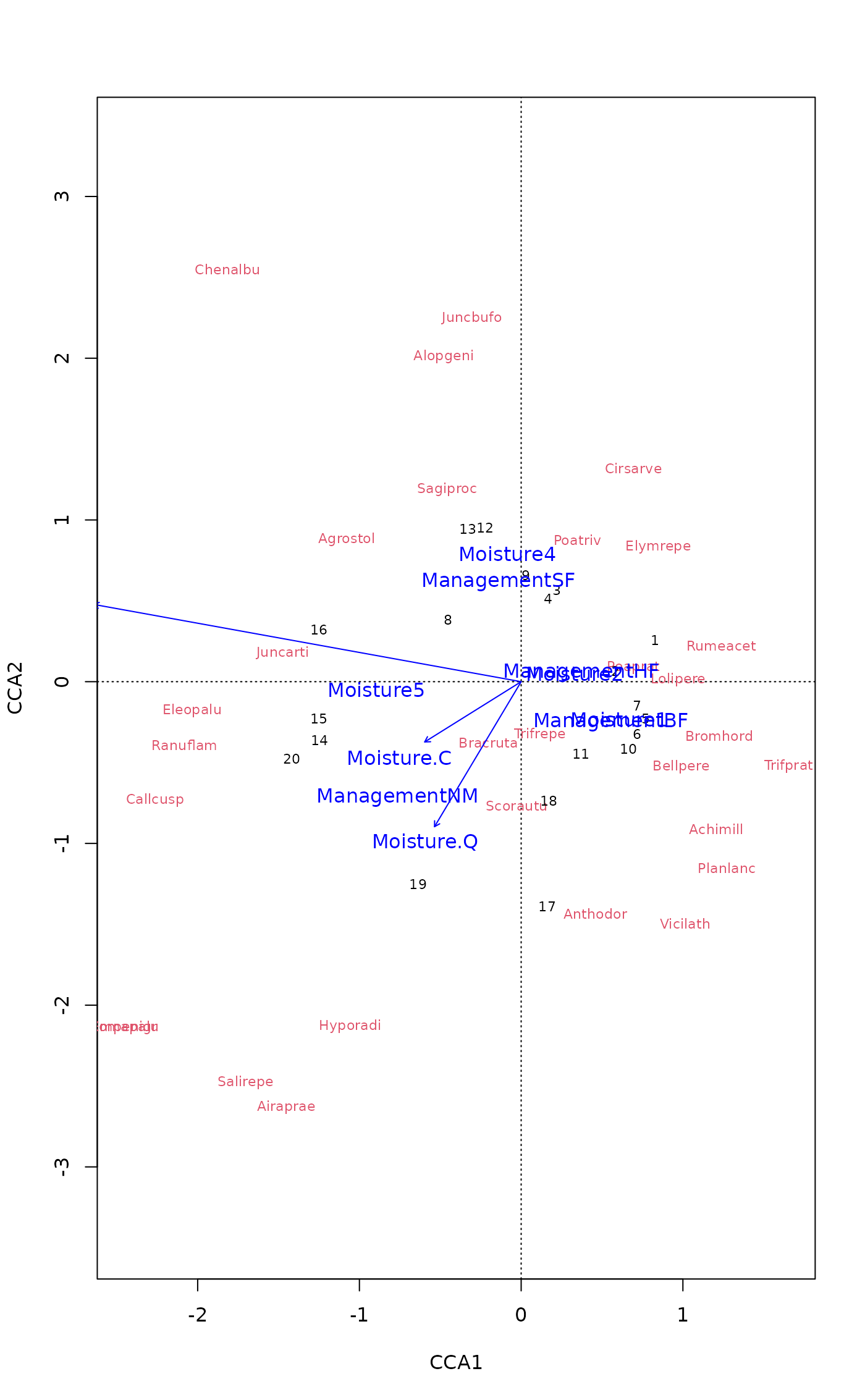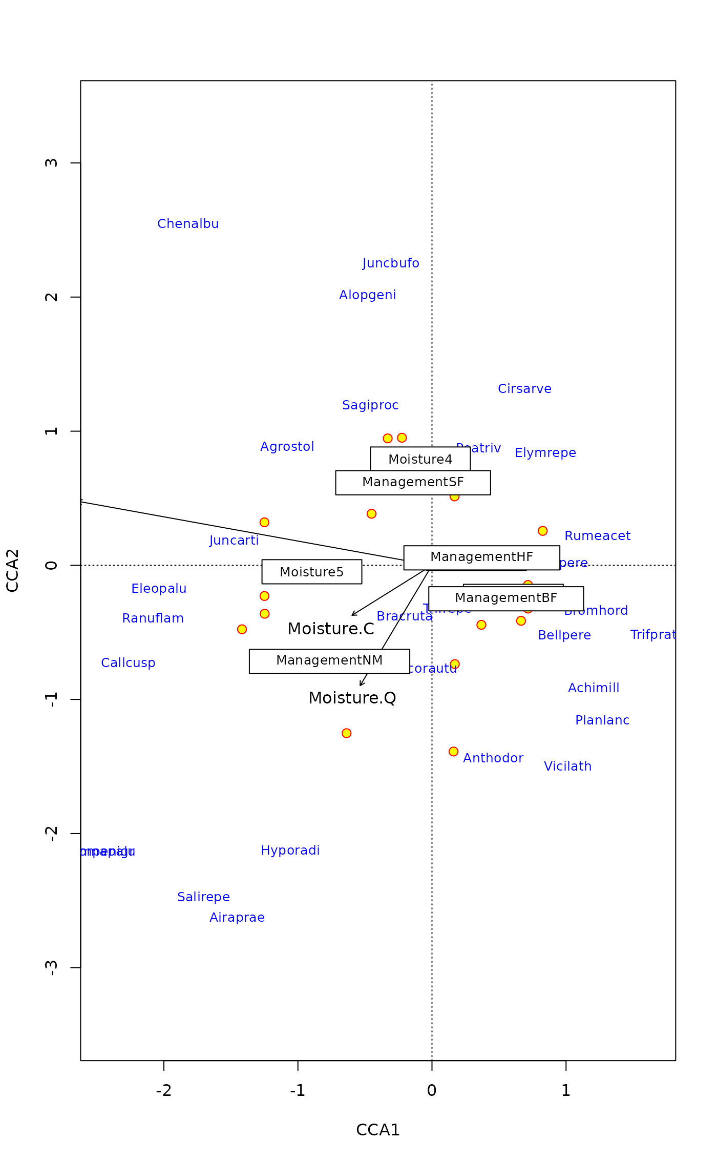 scrs <- scores(rda(dune ~ A1 + Moisture + Management, dune.env),