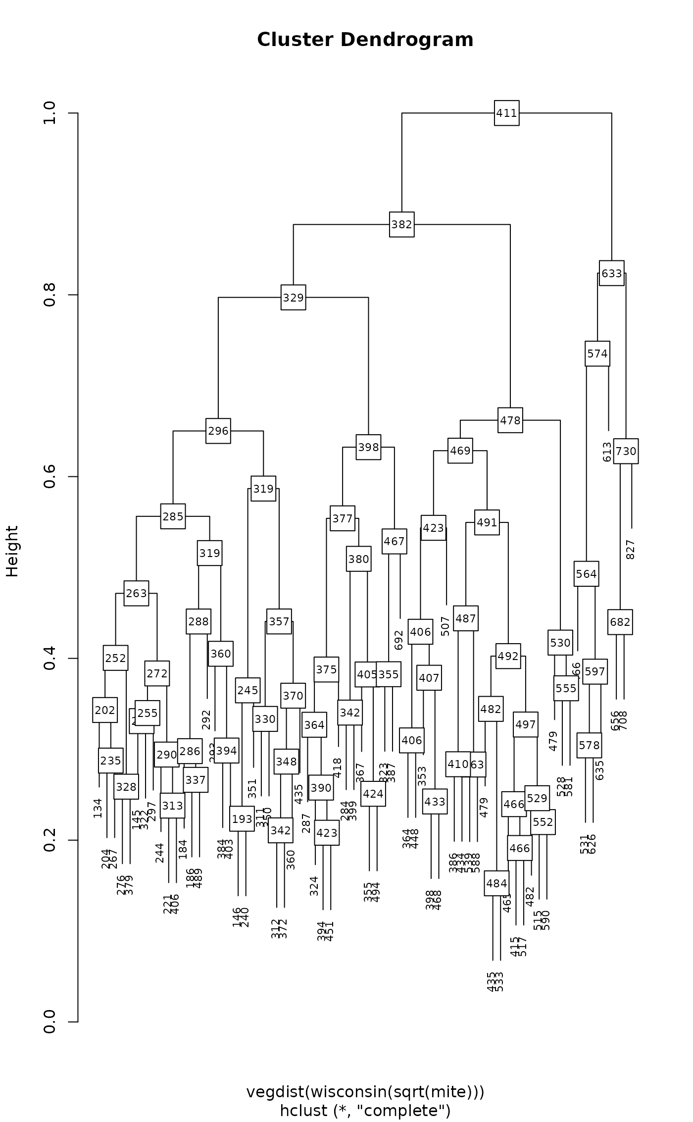 hc <- hclust(vegdist(wisconsin(sqrt(mite))))