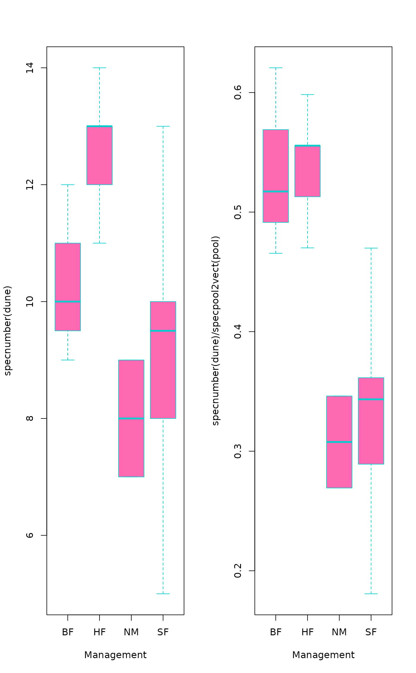 boxplot(specnumber(dune) ~ Management, data = dune.env,