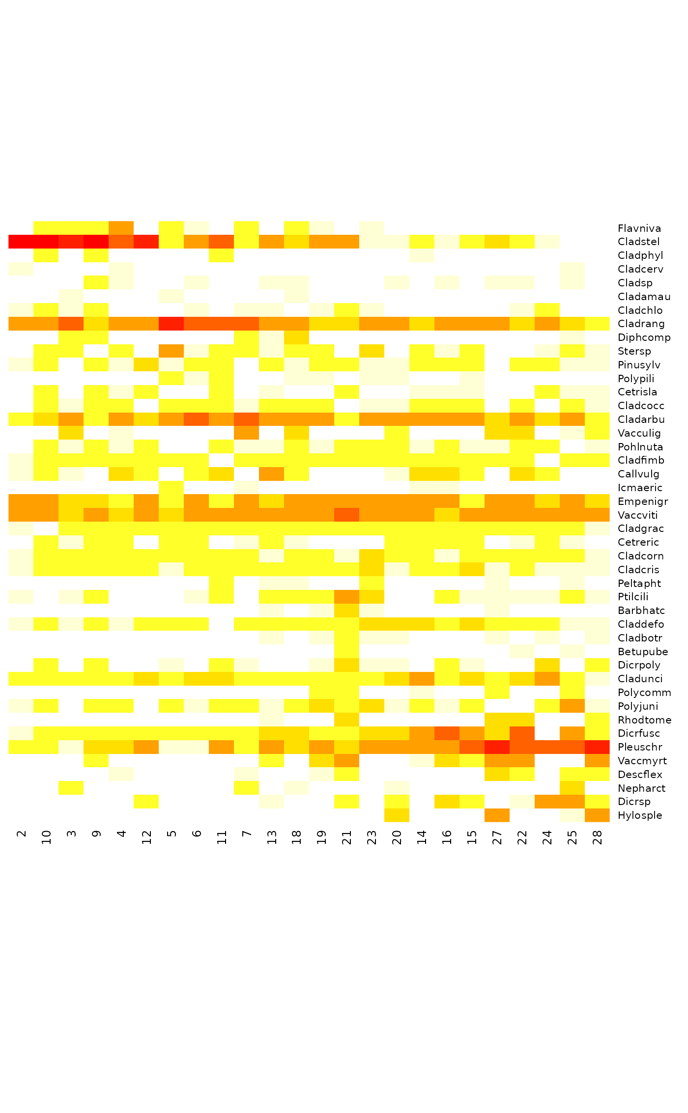 vegemite(varespec, sp=sel$sp, site=sel$site, scale="Hult")