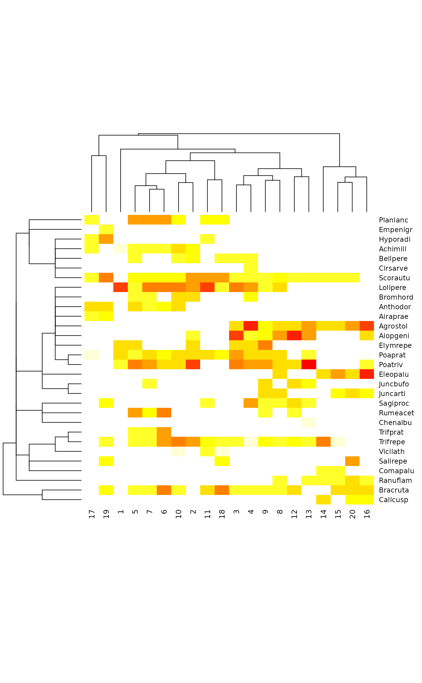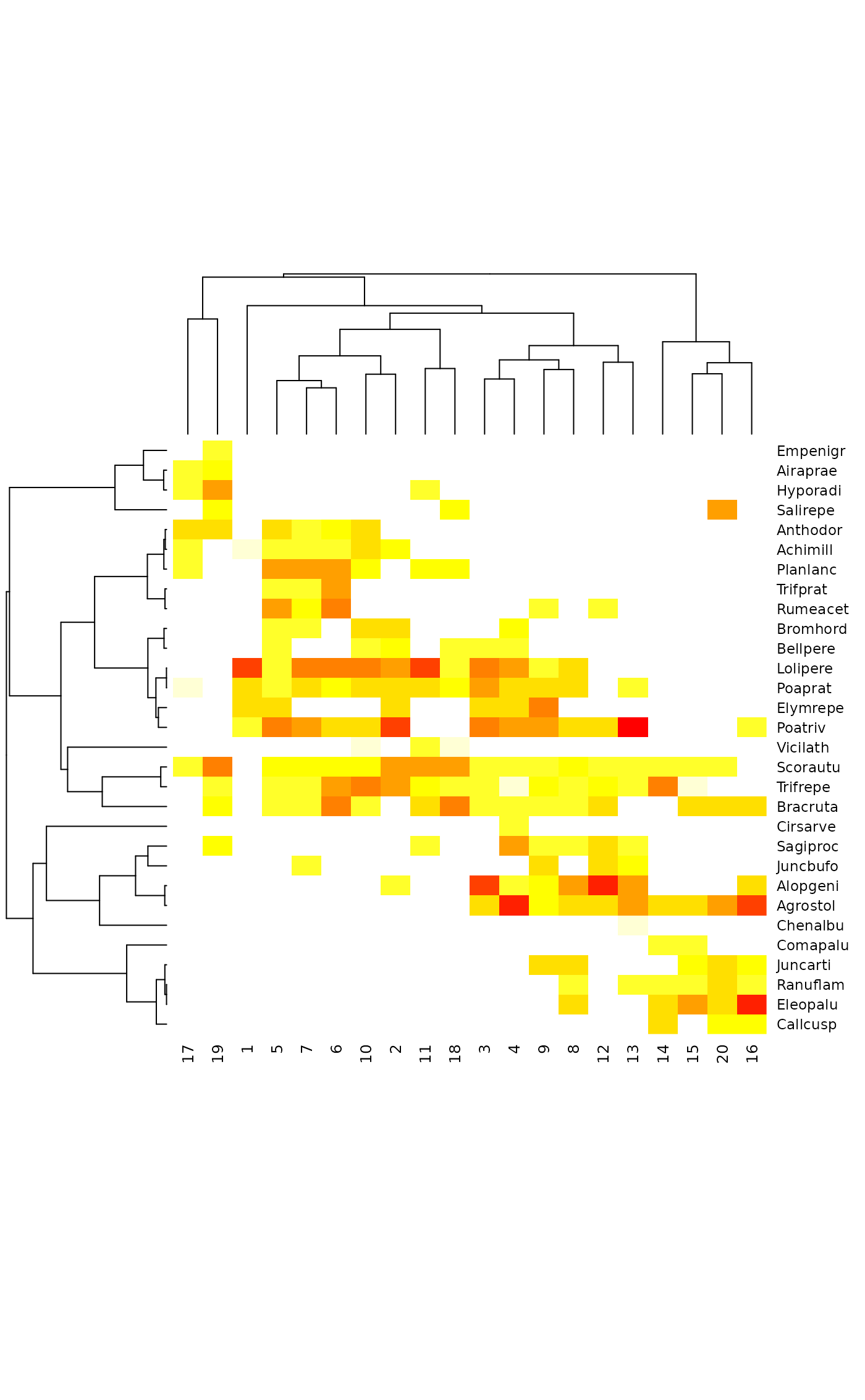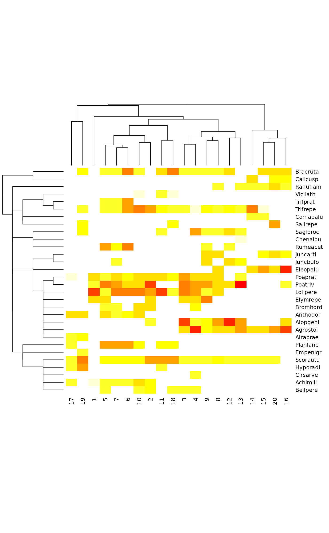 tabasco(dune, plotree, sp.ind = taxontree, Colv = FALSE)