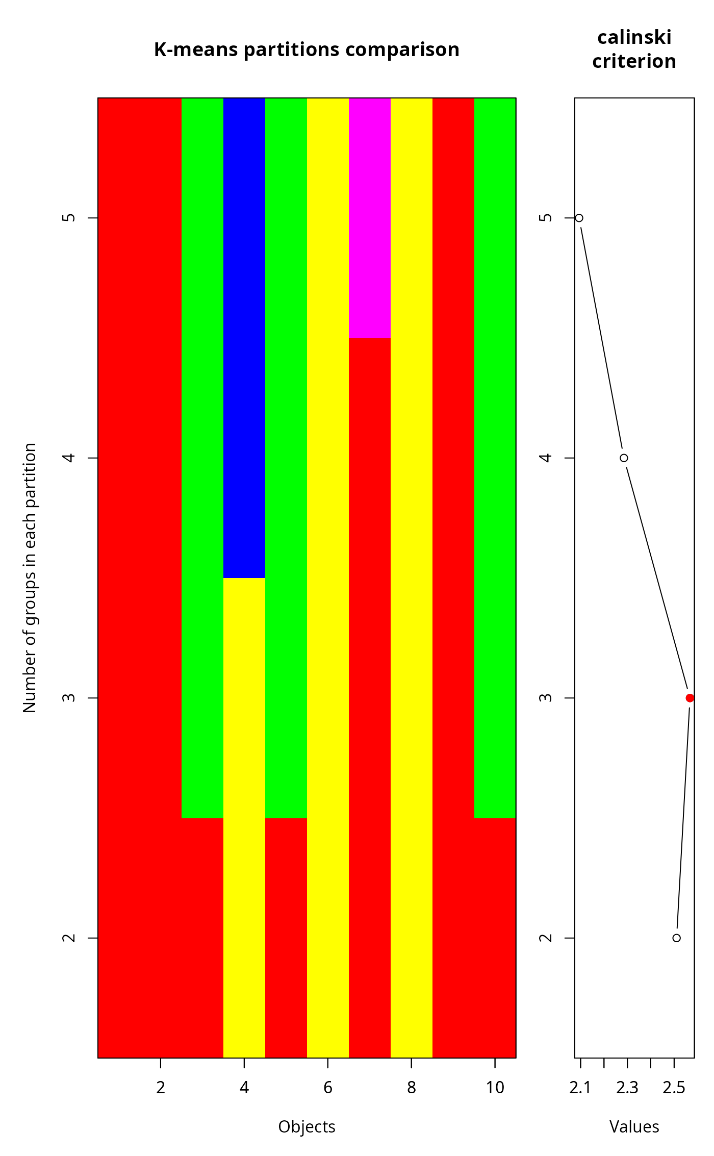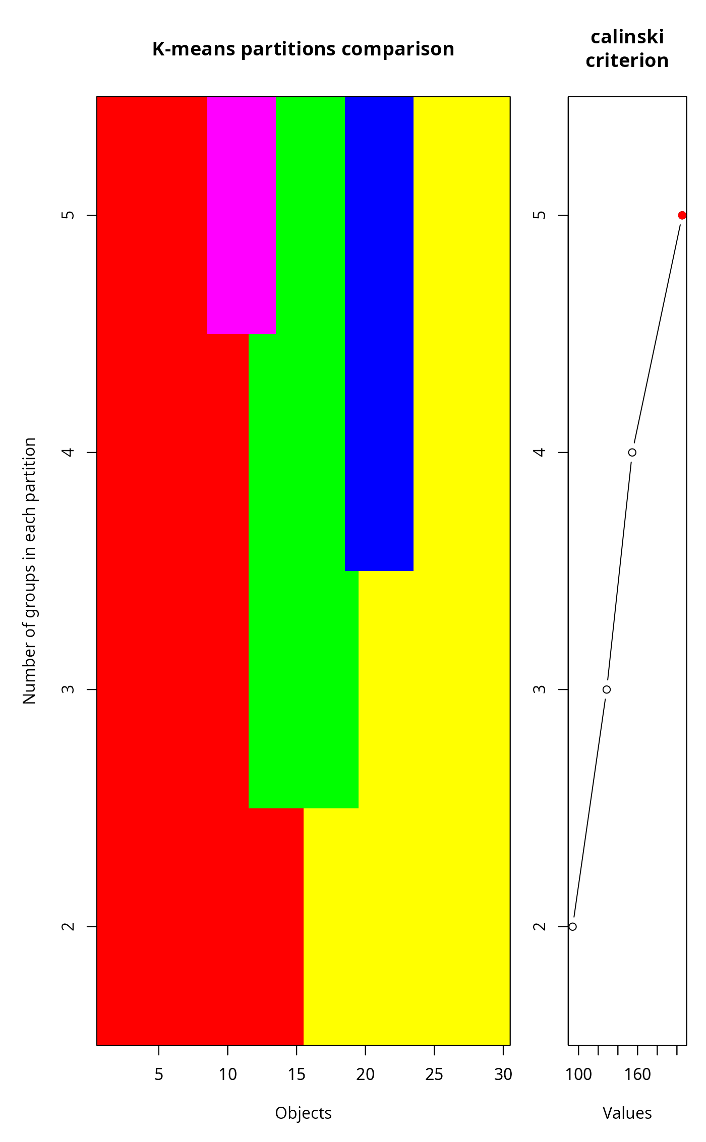 res <- cascadeKM(vec, 2, 5, iter = 25, criterion = 'calinski')