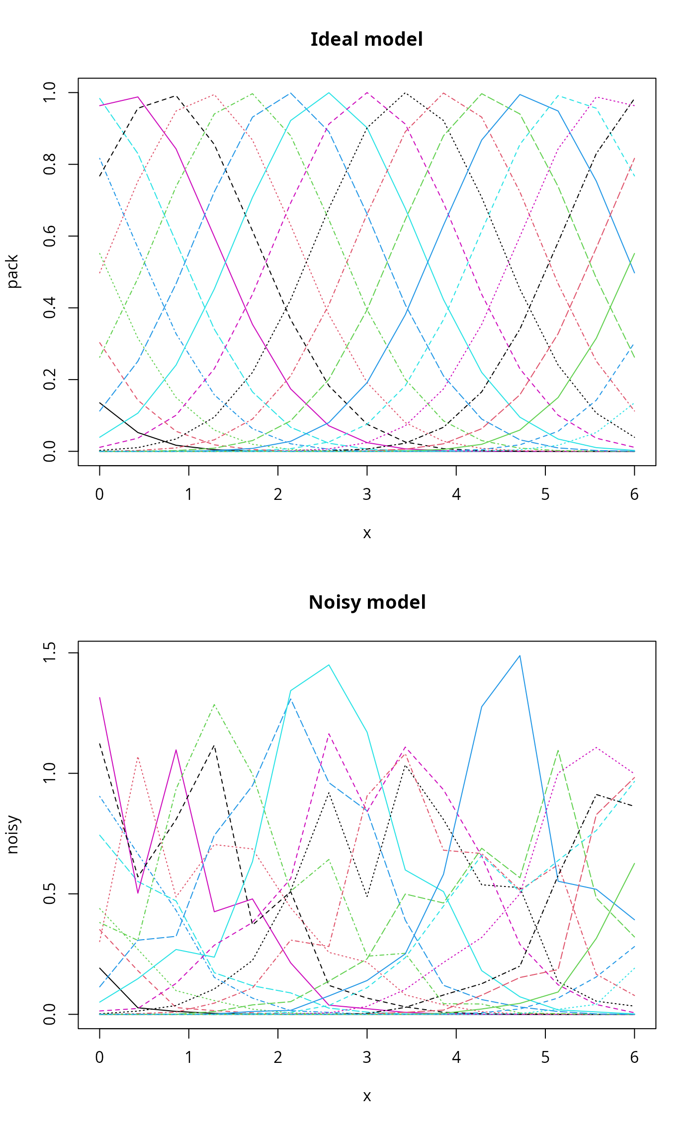 matplot(x, noisy, type="l", main="Noisy model")