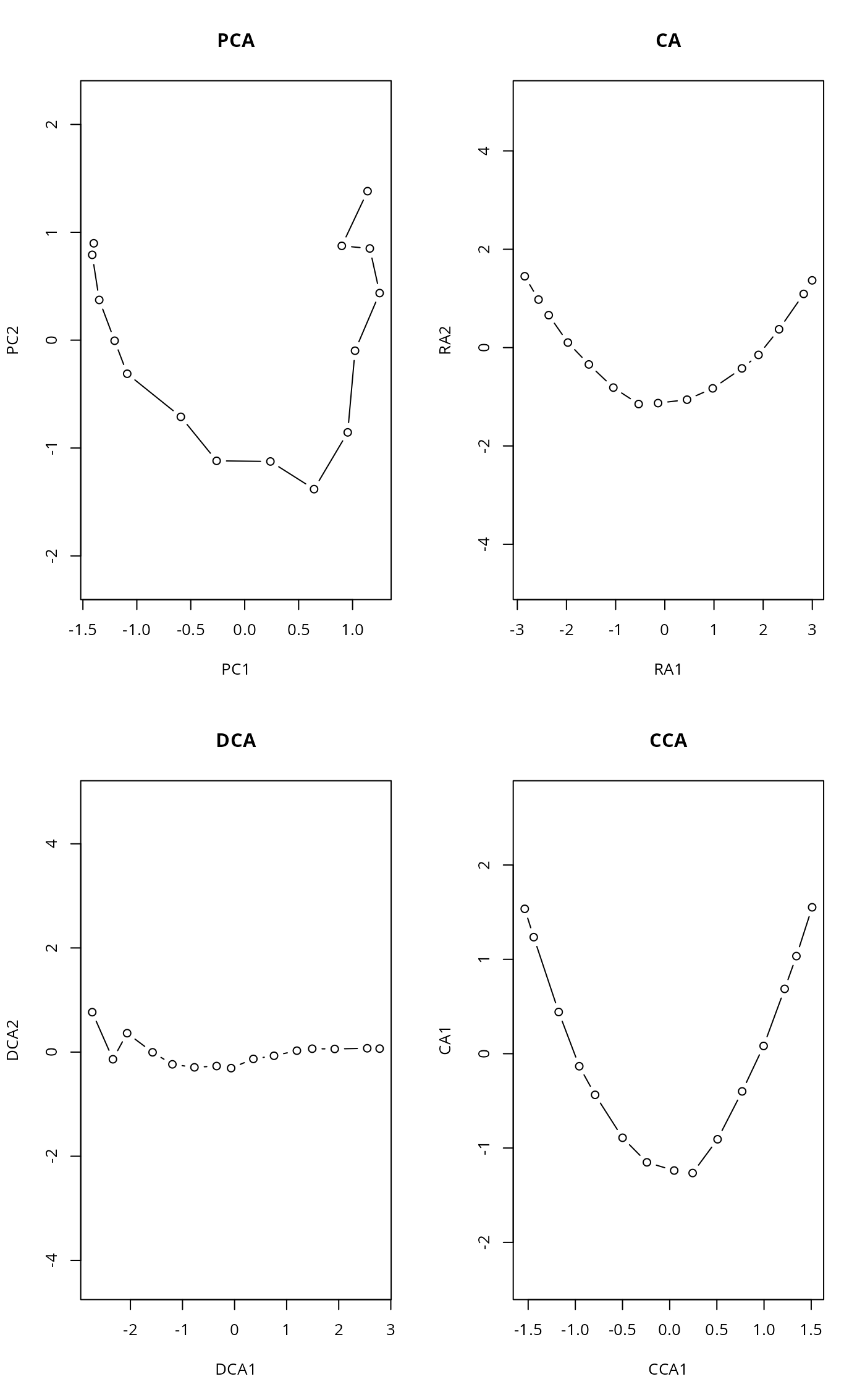 plot(scores(decorana(noisy)), type="b", main="DCA", asp=1)