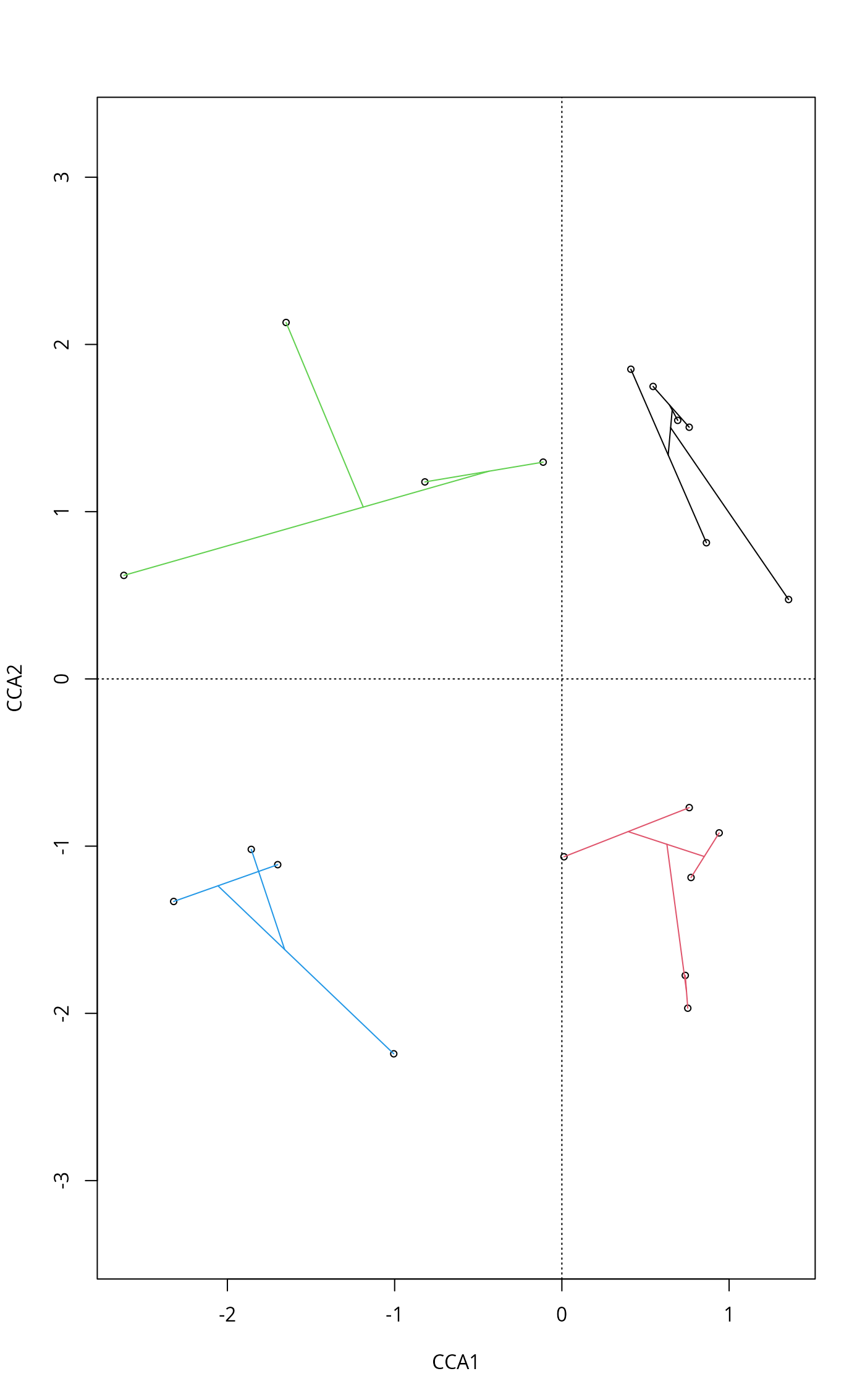 ordicluster(mod, cl, prune=3, col = cutree(cl, 4))