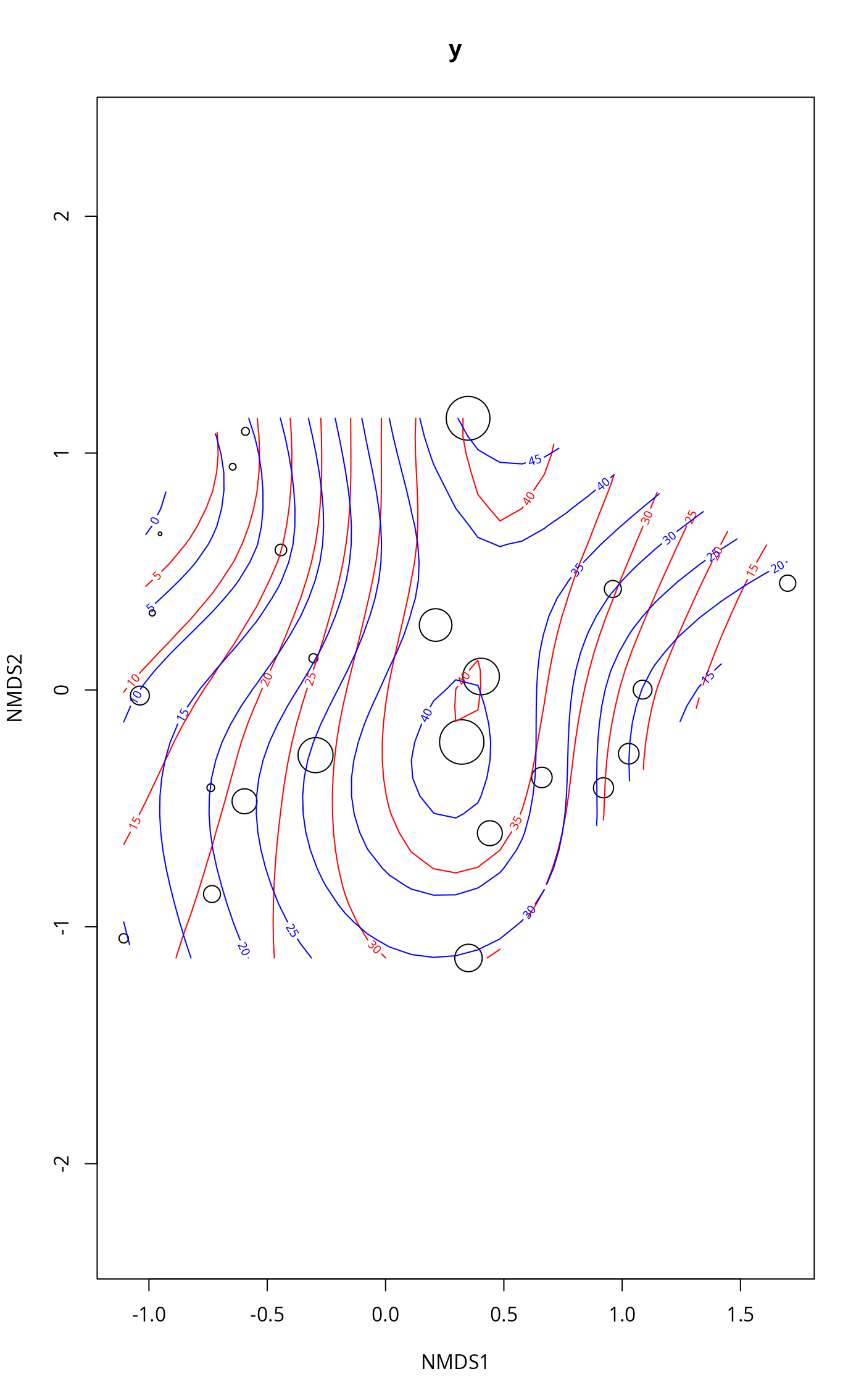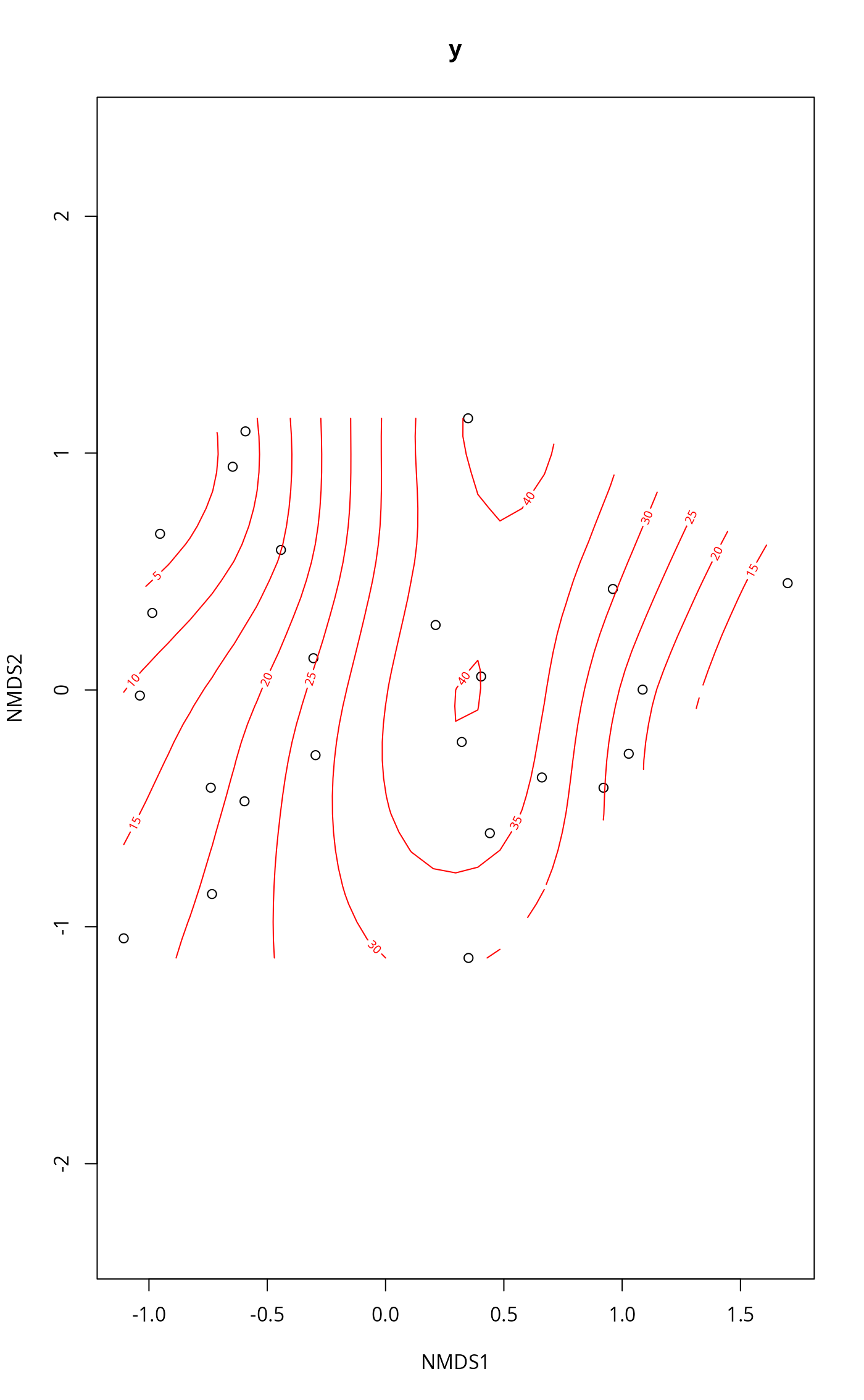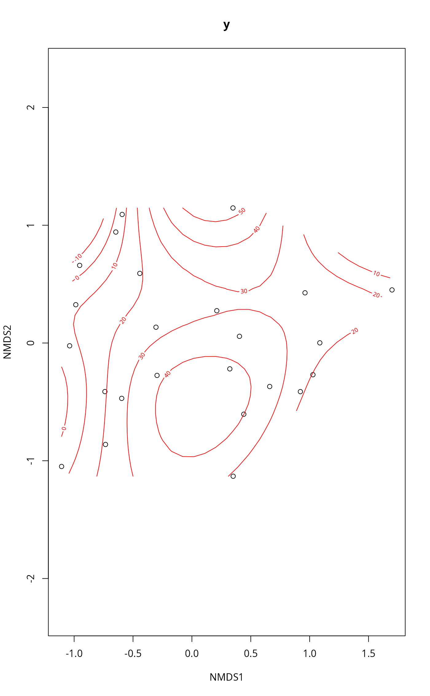 ordisurf(x, y, choices = c(1, 2), knots = 10,