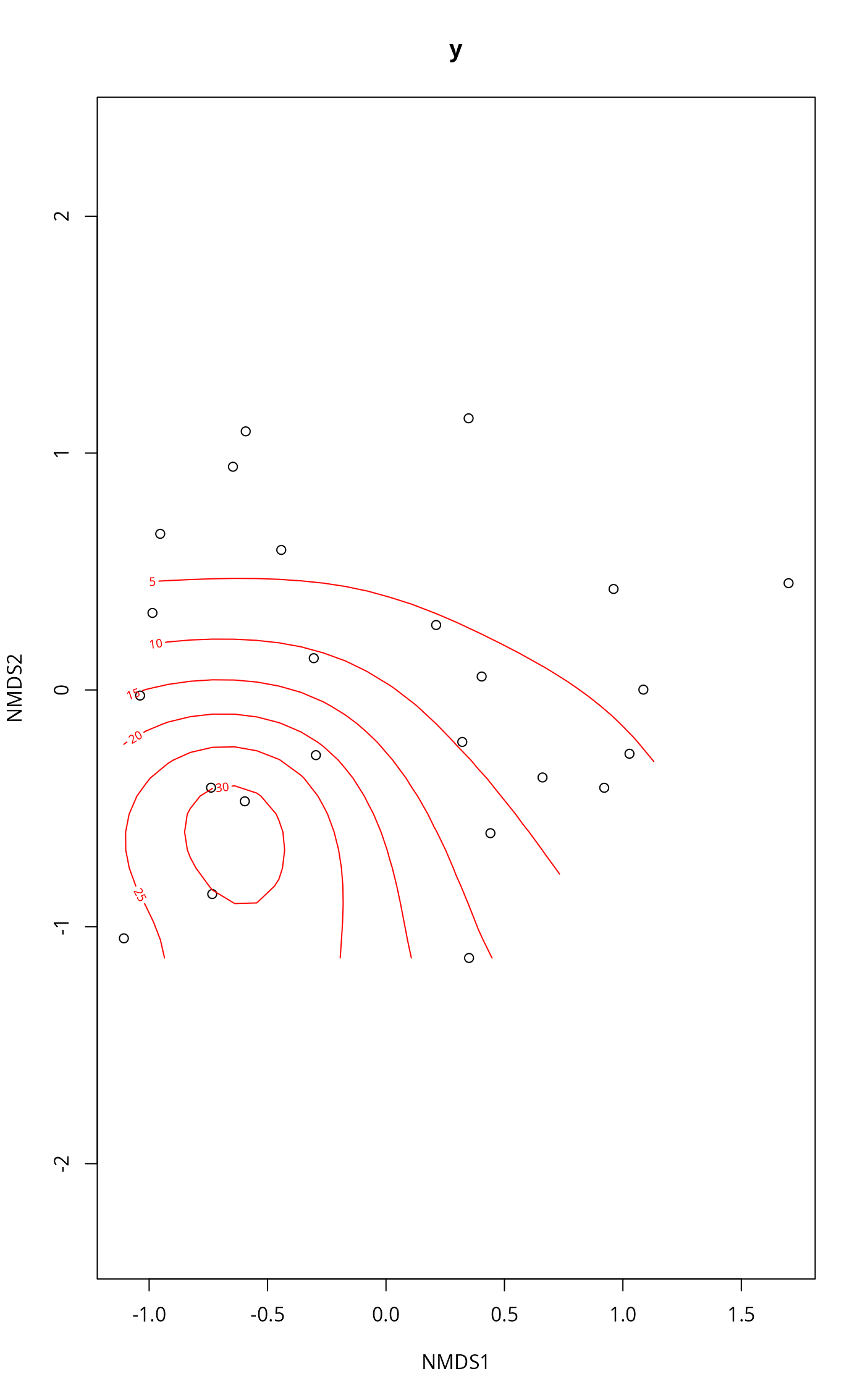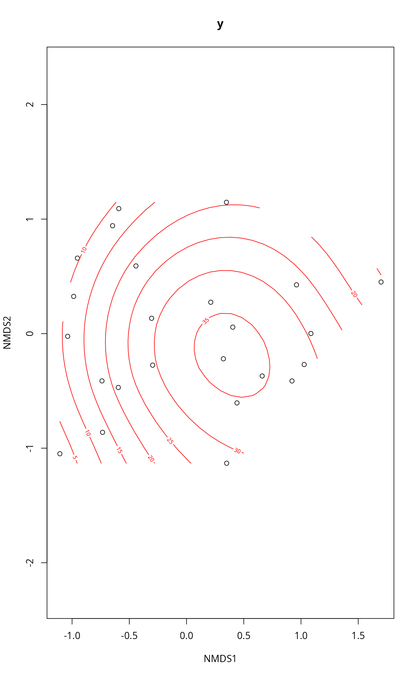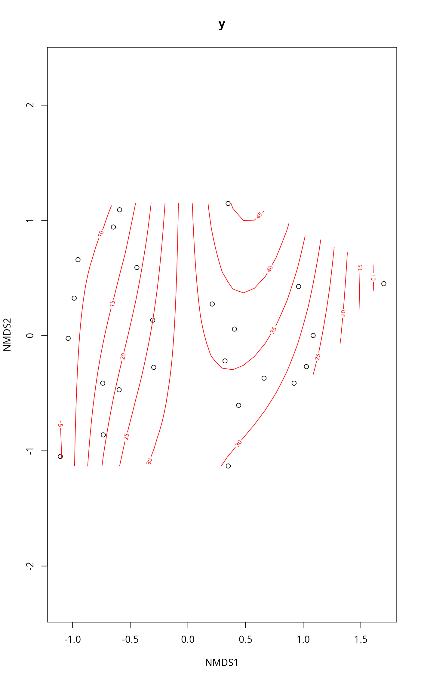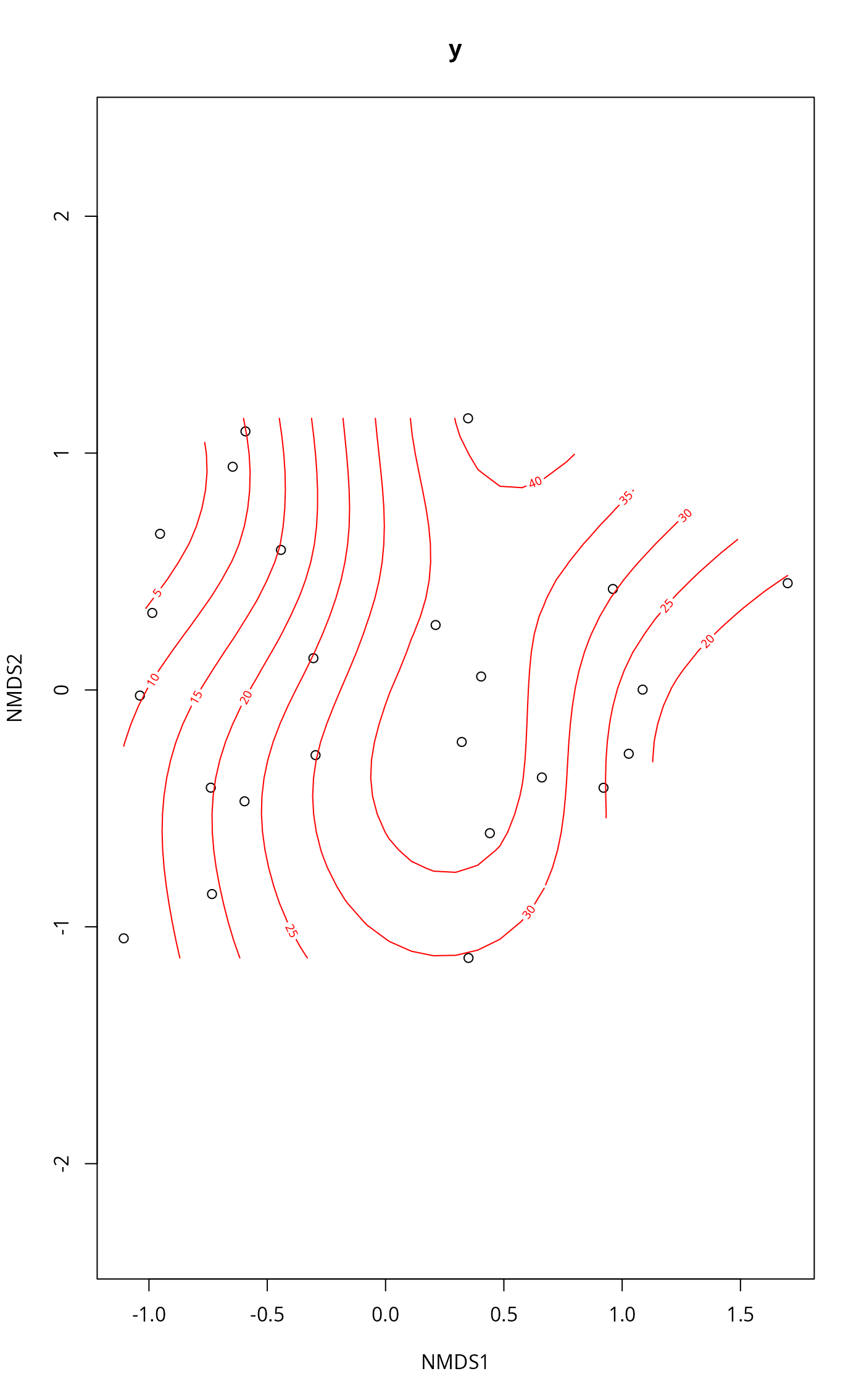 ordisurf(x, y, choices = c(1, 2), knots = 10,