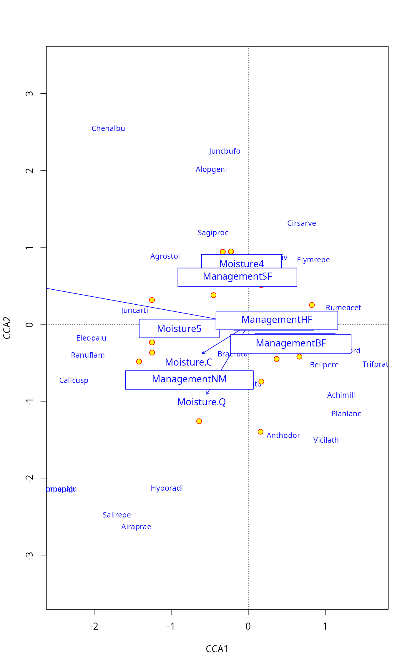 mod <- cca(dune ~ Moisture + Management, dune.env)