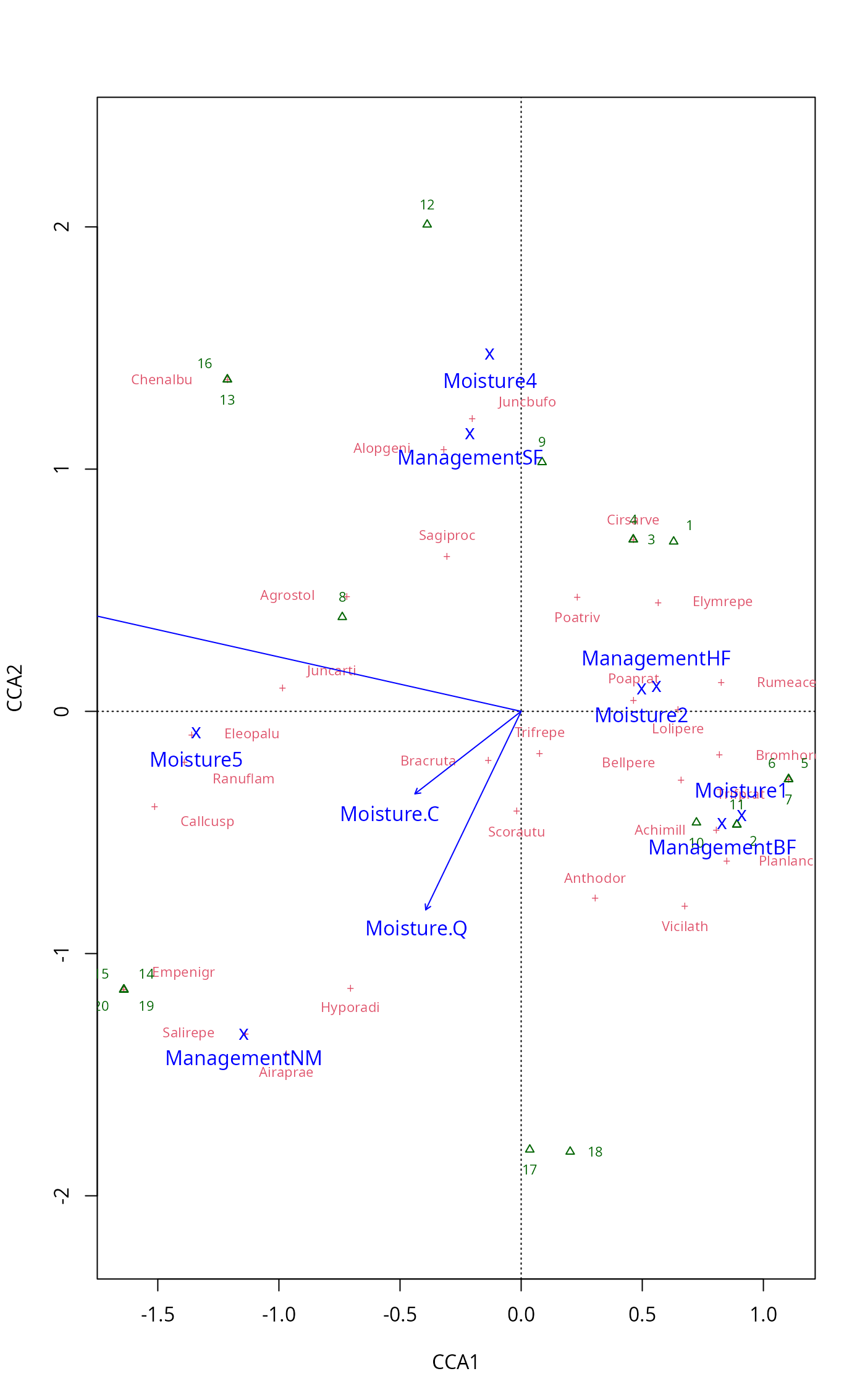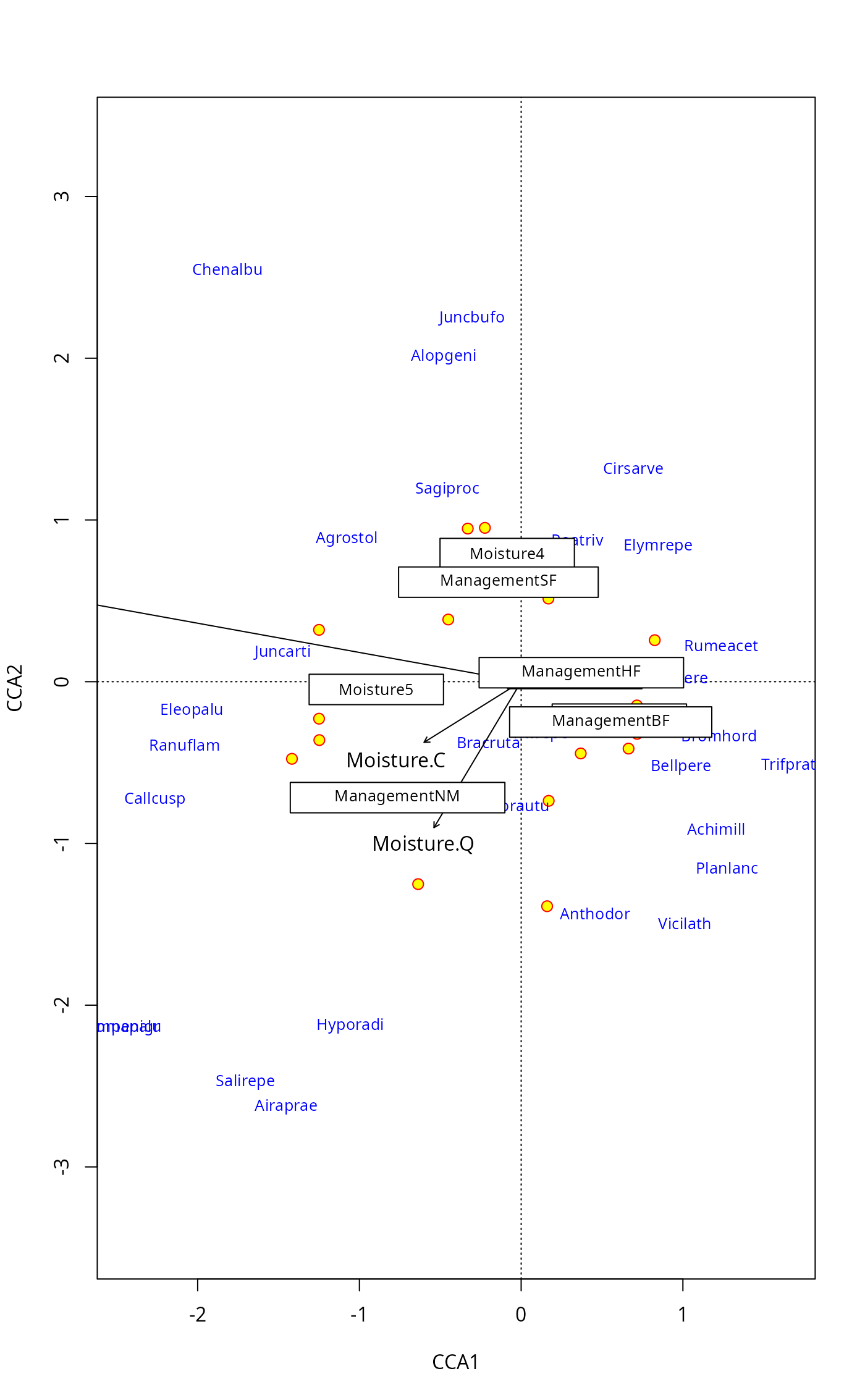 scrs <- scores(rda(dune ~ A1 + Moisture + Management, dune.env),