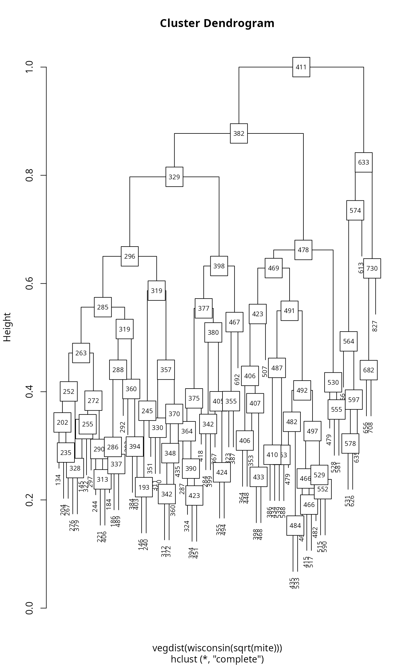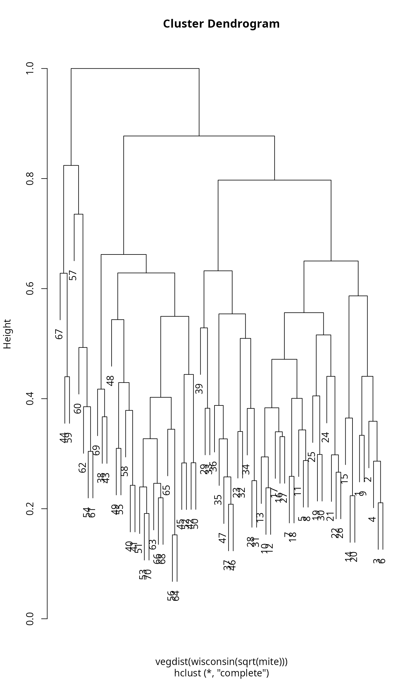hc <- hclust(vegdist(wisconsin(sqrt(mite))))