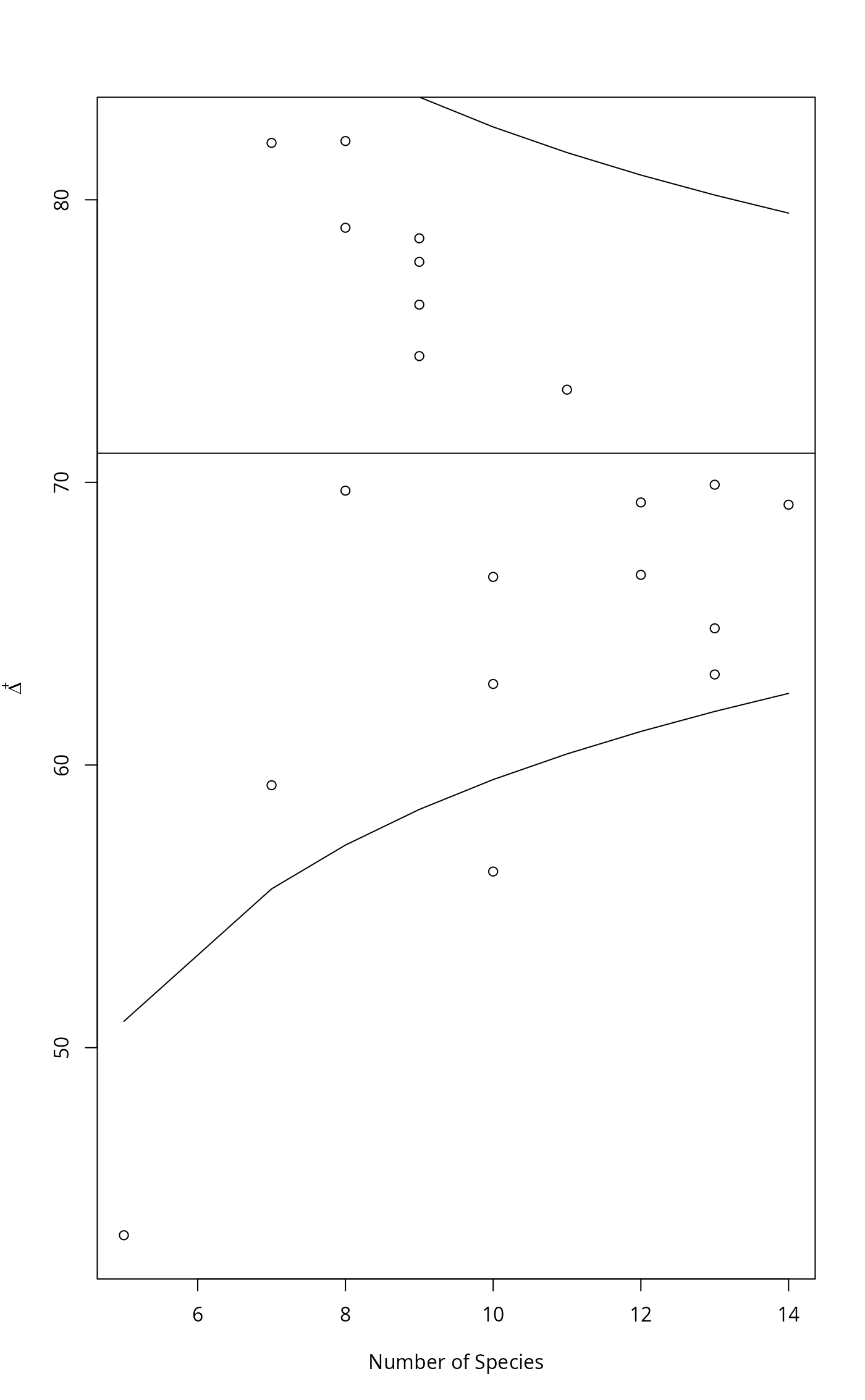 Function plot.taxondive plots \(\Delta^+\) against Number of