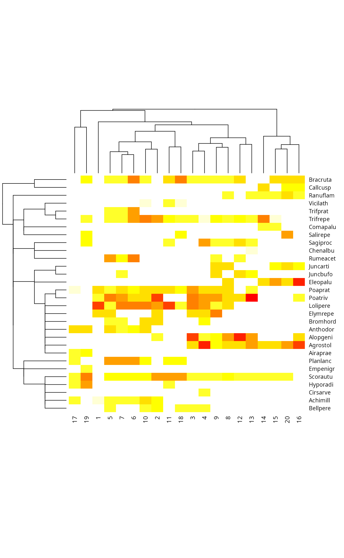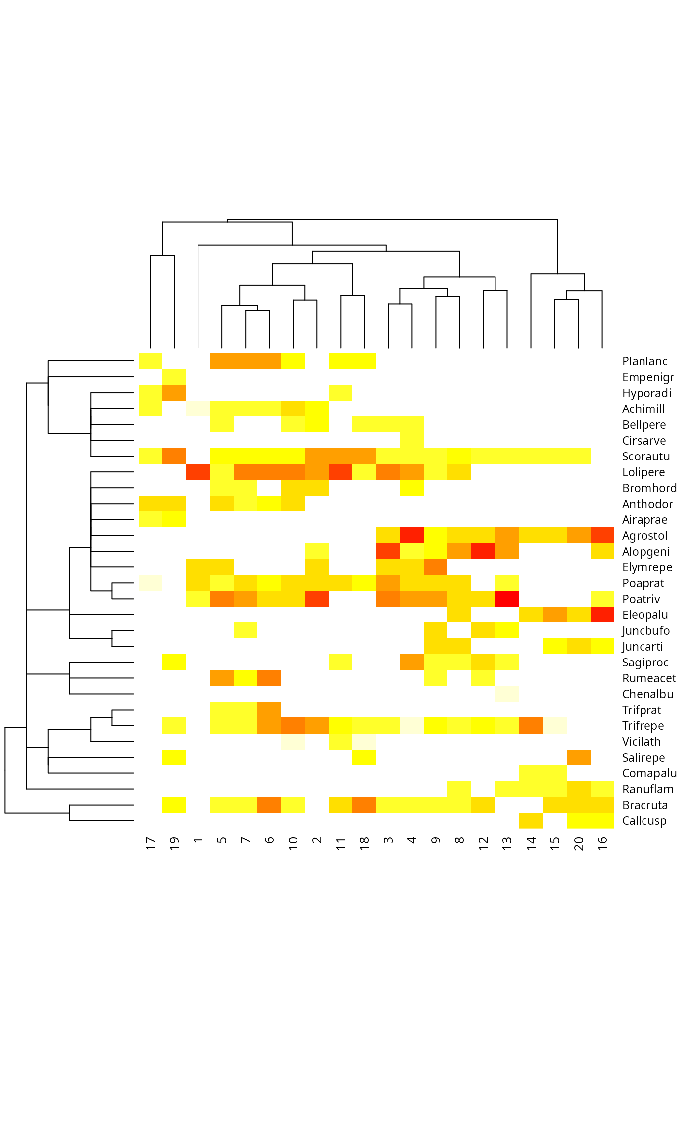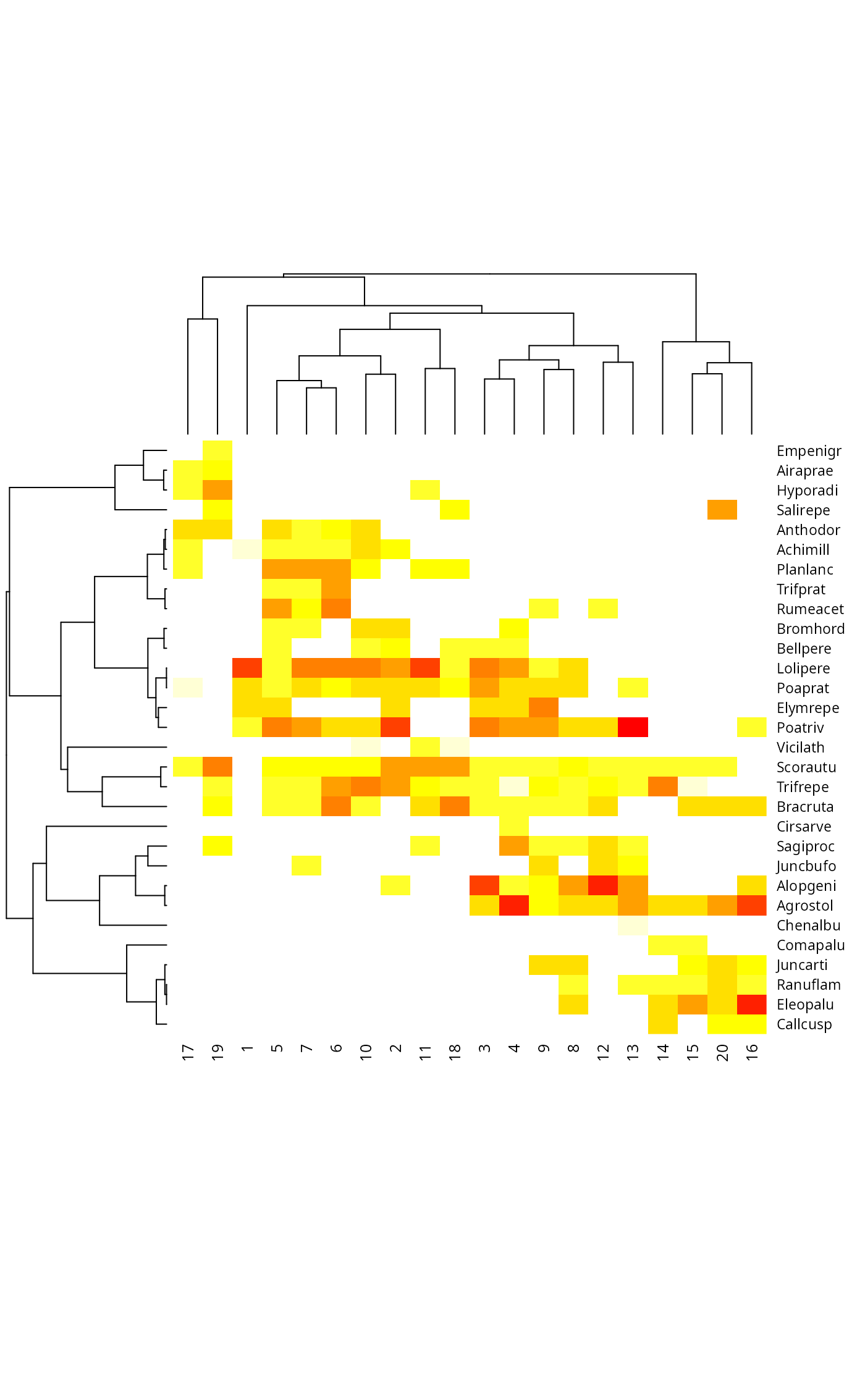 tabasco(dune, plotree, sp.ind = taxontree, Colv = FALSE)