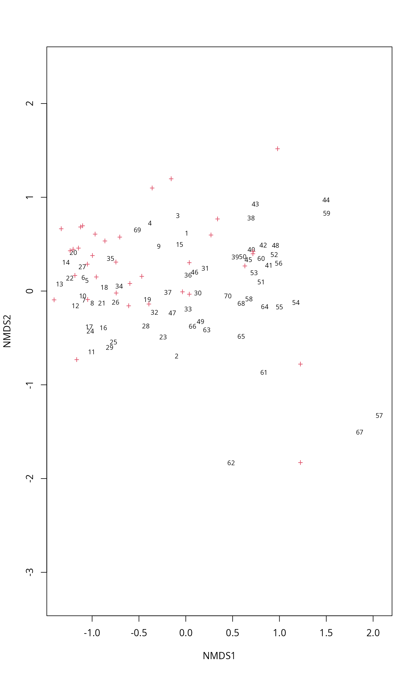 points(wascores(scores(mod), mite, expand = TRUE), pch="+", col=2)