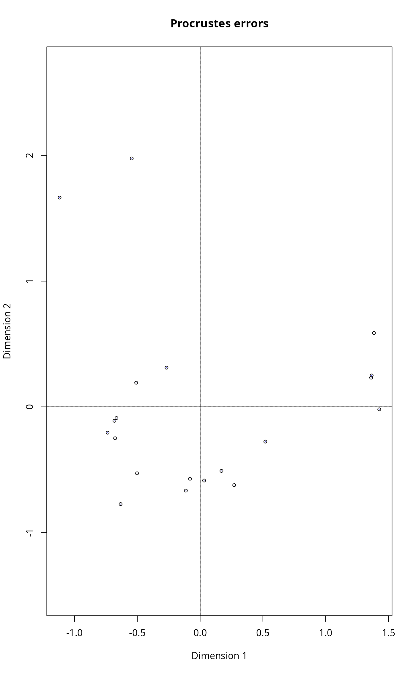 plot(procrustes(ord, ca, choices=1:2, scaling="sites"))