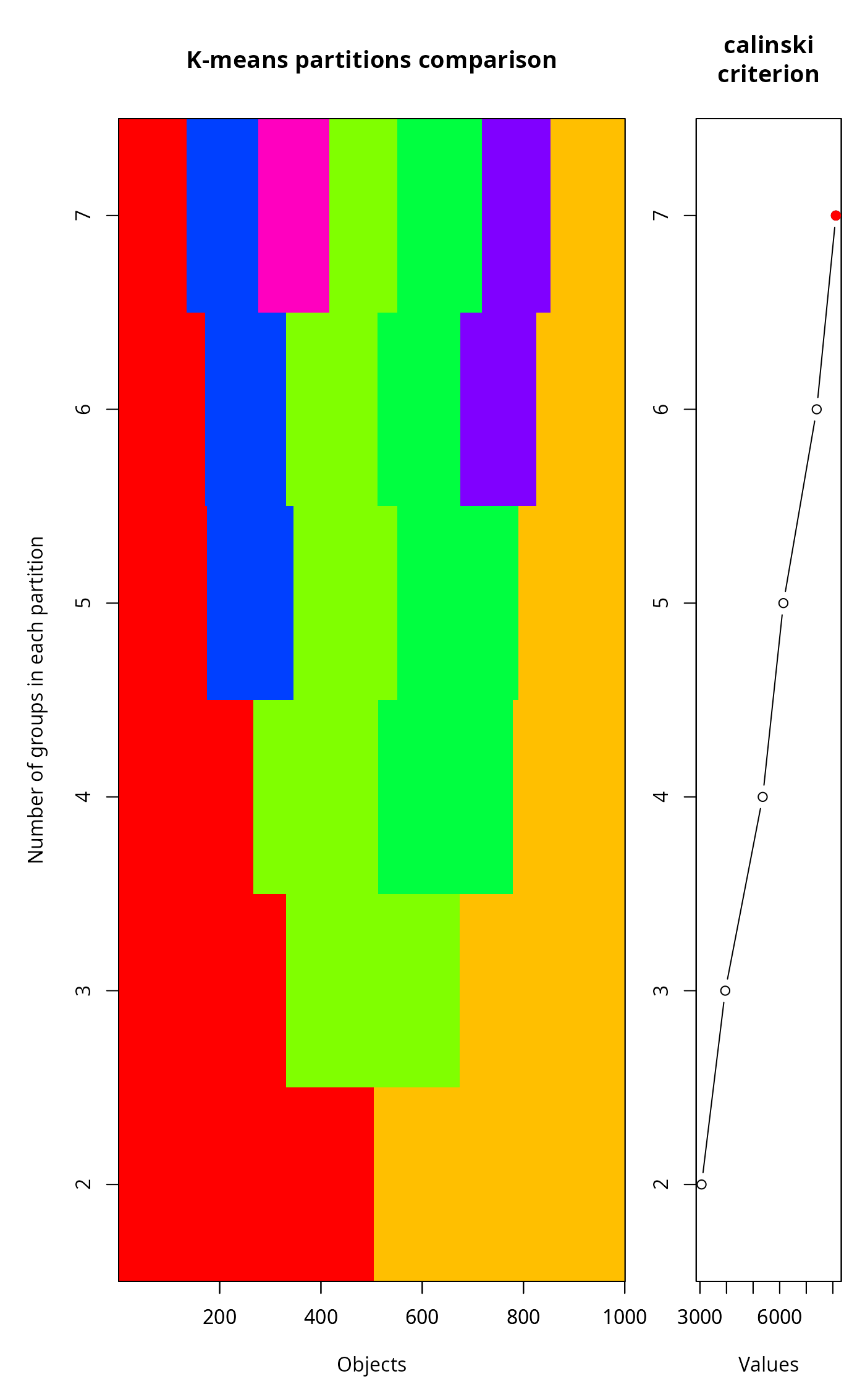 res <- cascadeKM(vec, 2, 7, iter = 10, criterion = 'calinski')