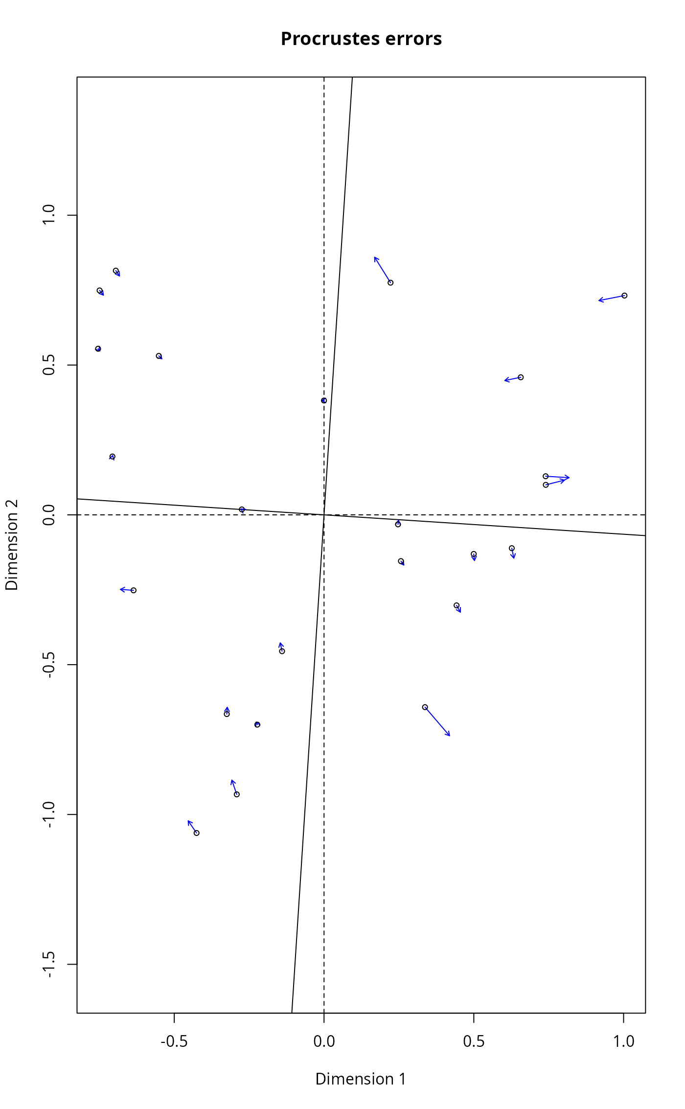 plot(procrustes(rda(sptrans), cca(varespec)))