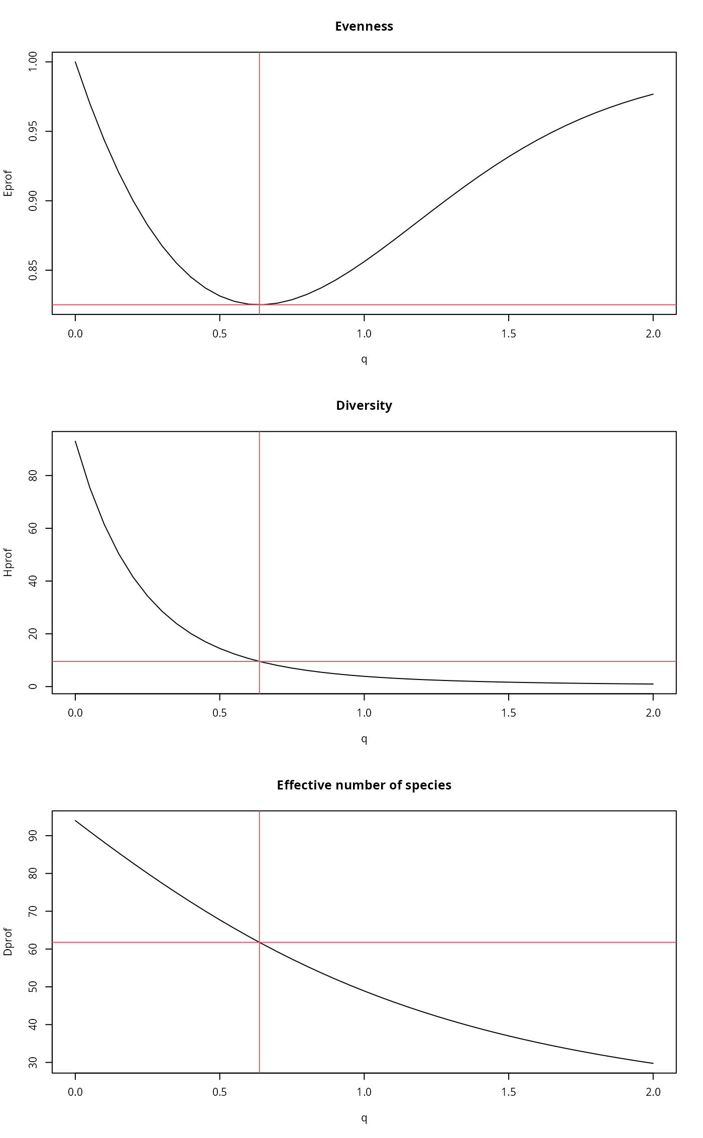 Mendes et al. (2008) advocated the use of \(q^\ast\) and corresponding diversity, evenness, and Hill numbers, because it is a unique value representing the diversity profile, and is is positively associated with rare species in the community, thus it is a potentially useful indicator of certain relative abundance distributions of the communities.