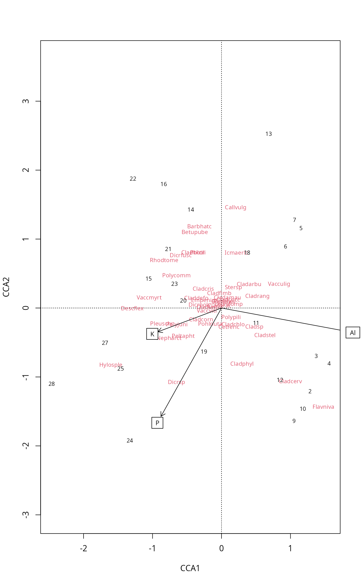 ord <- cca(varespec ~ Al + P + K, varechem)