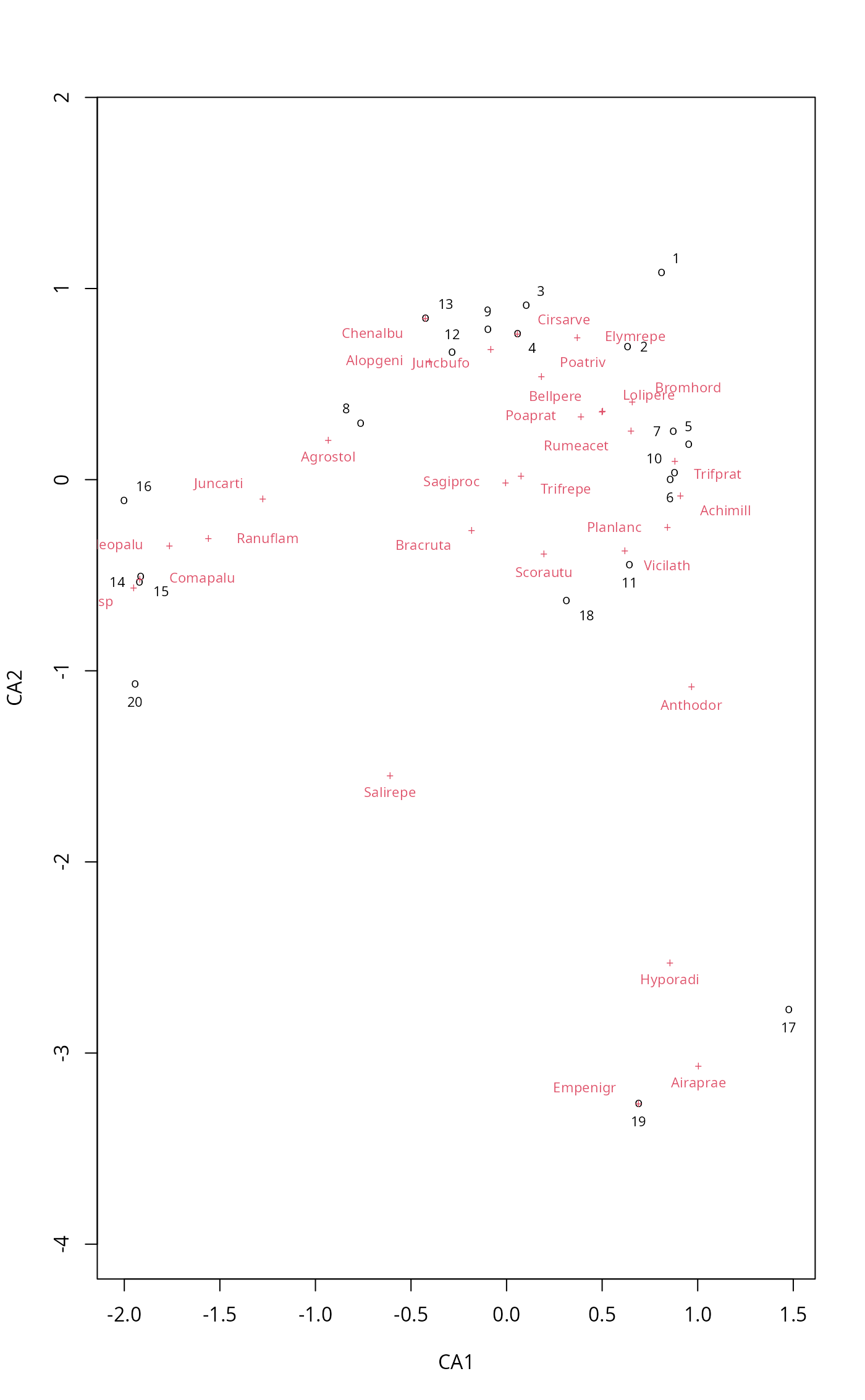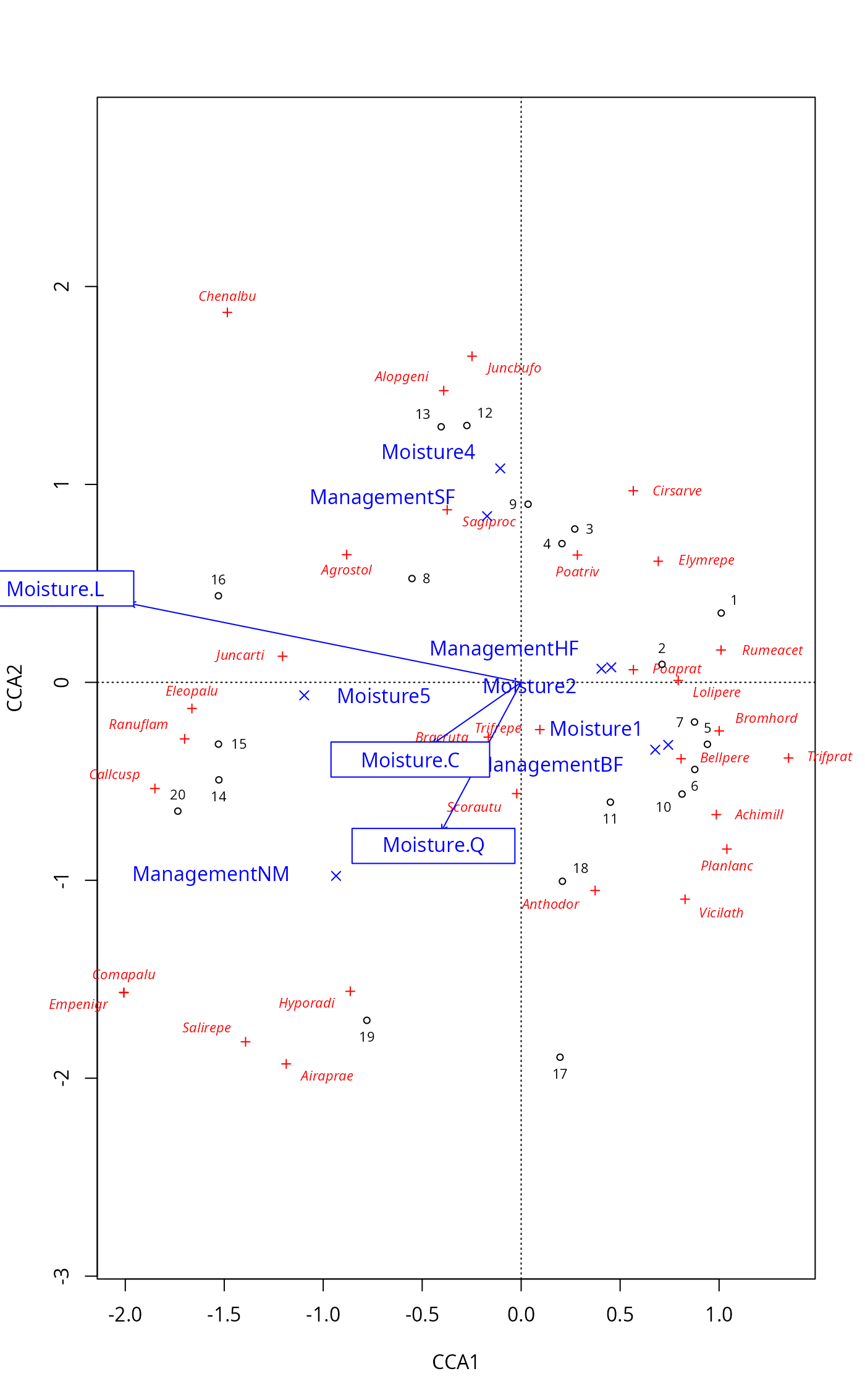 ord <- cca(dune ~ Management + Moisture, dune.env)