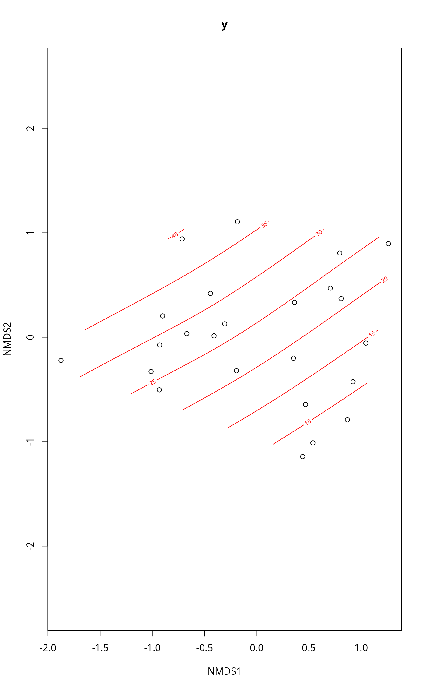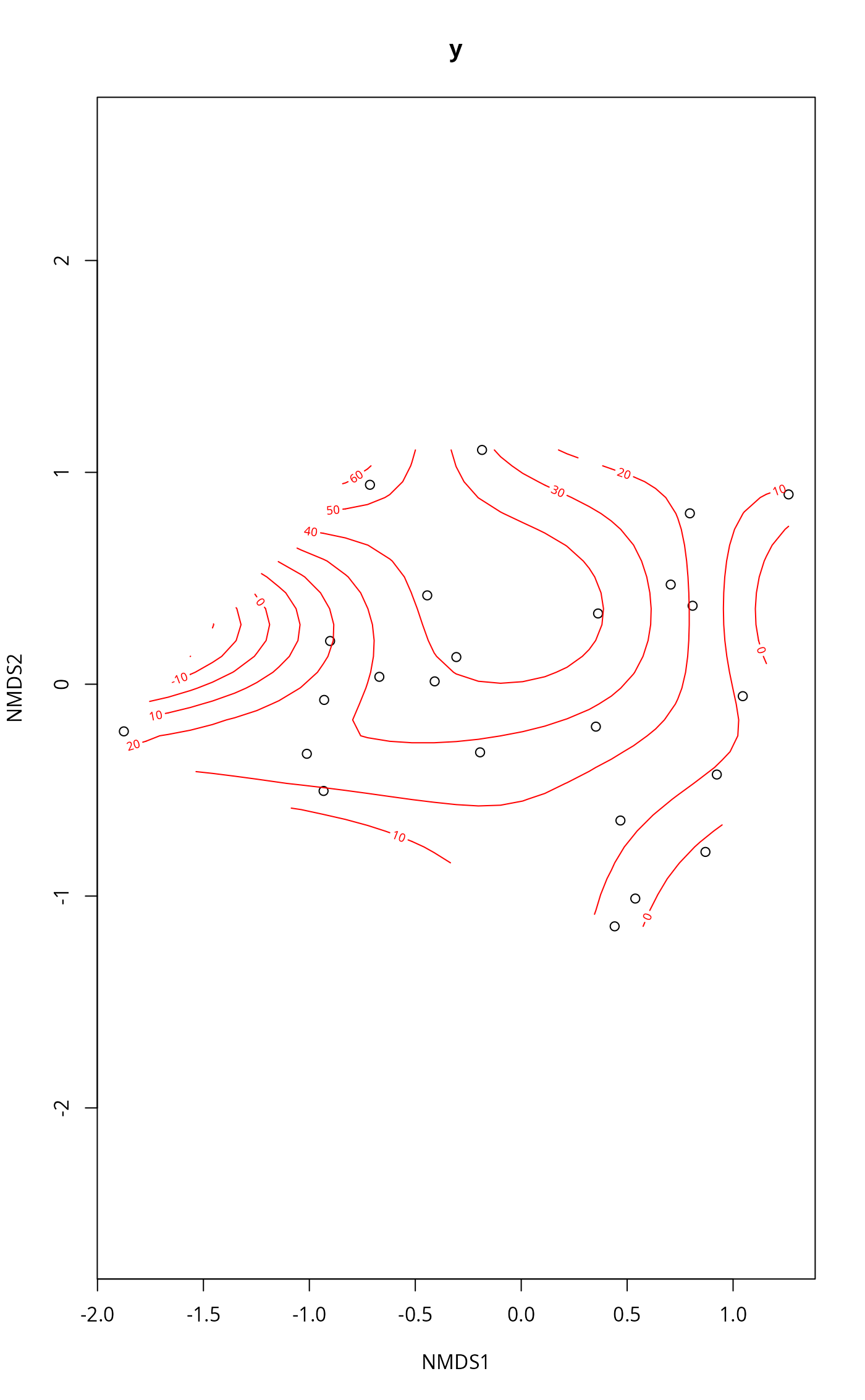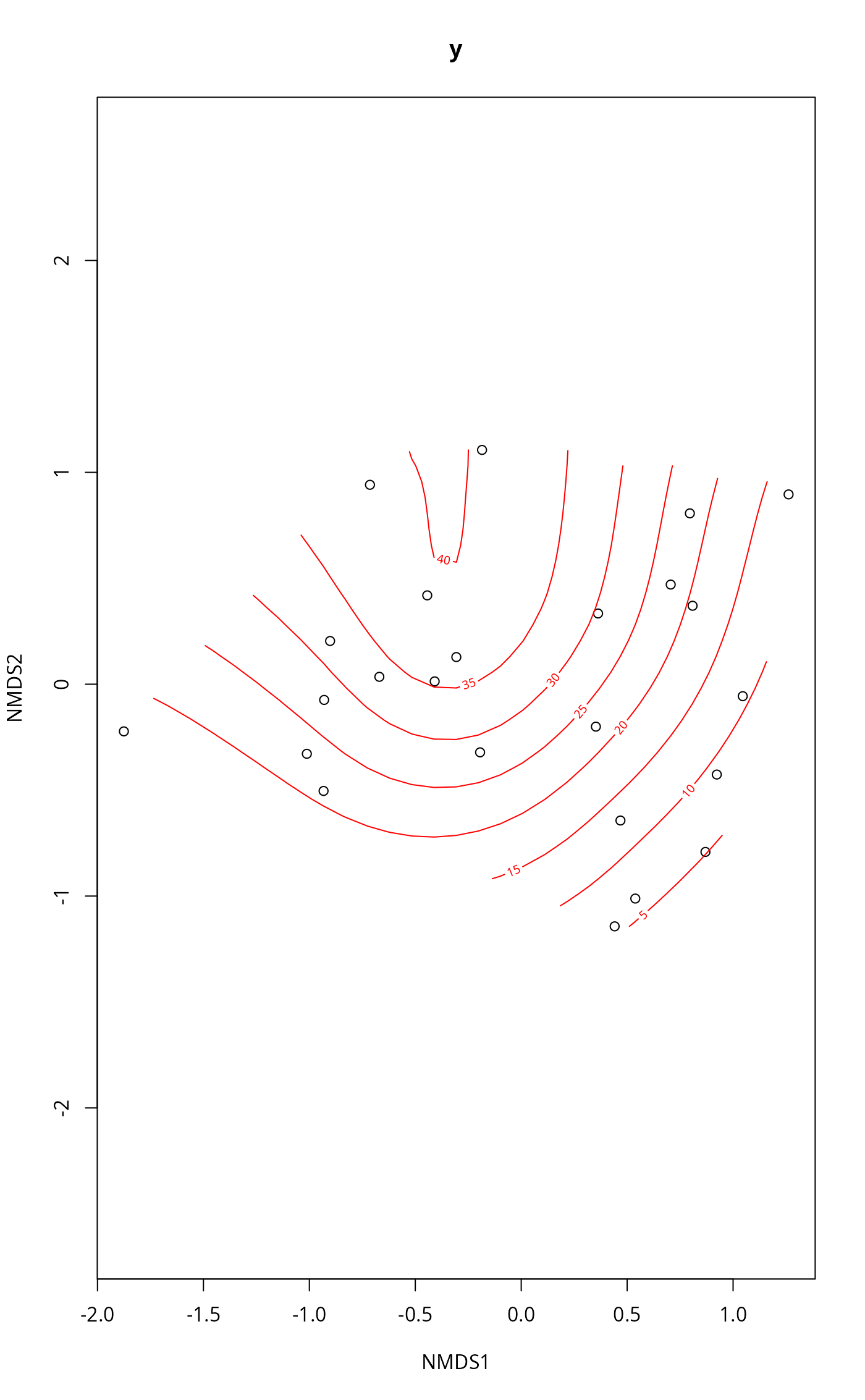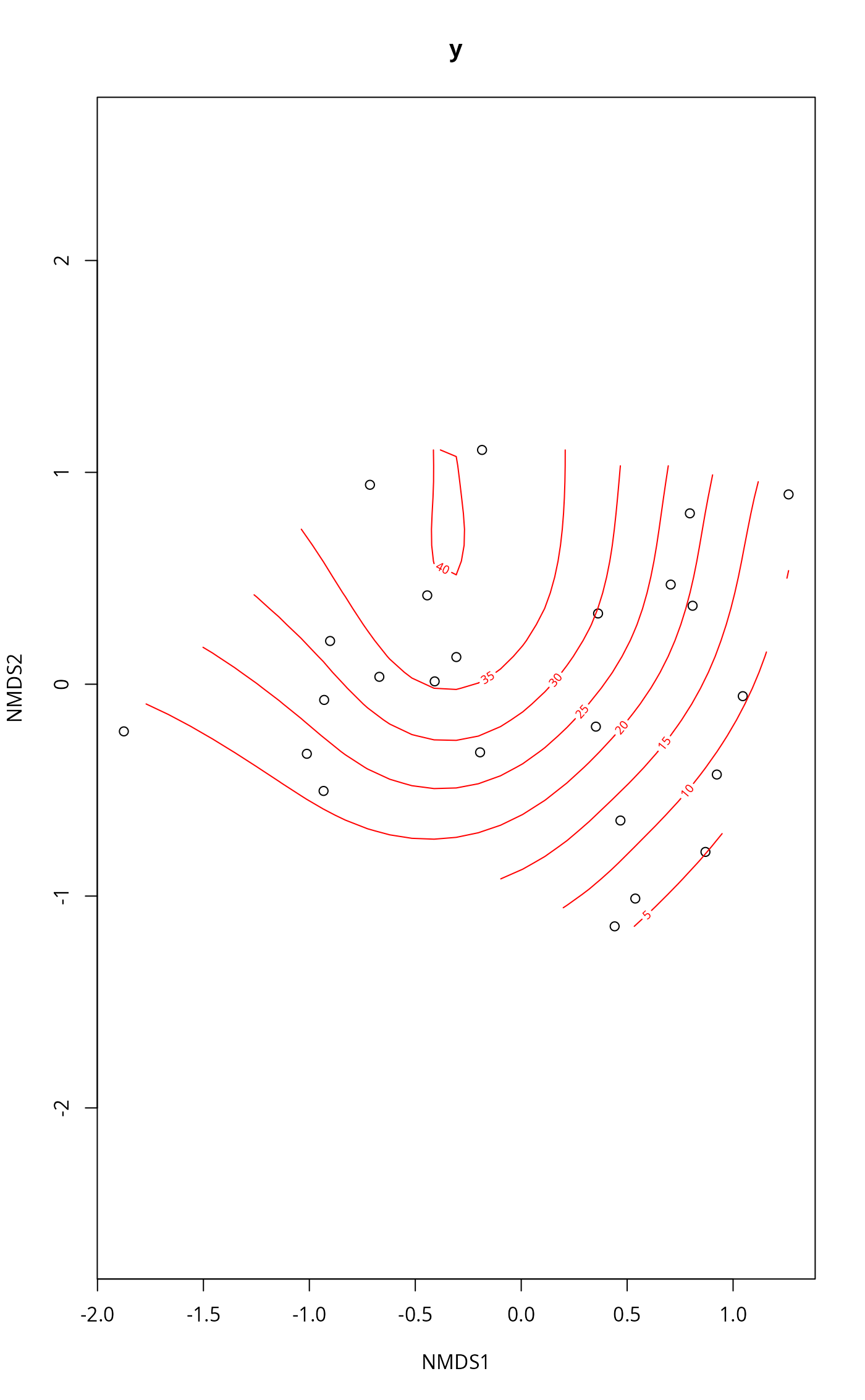 ordisurf(x, y, choices = c(1, 2), knots = 10,