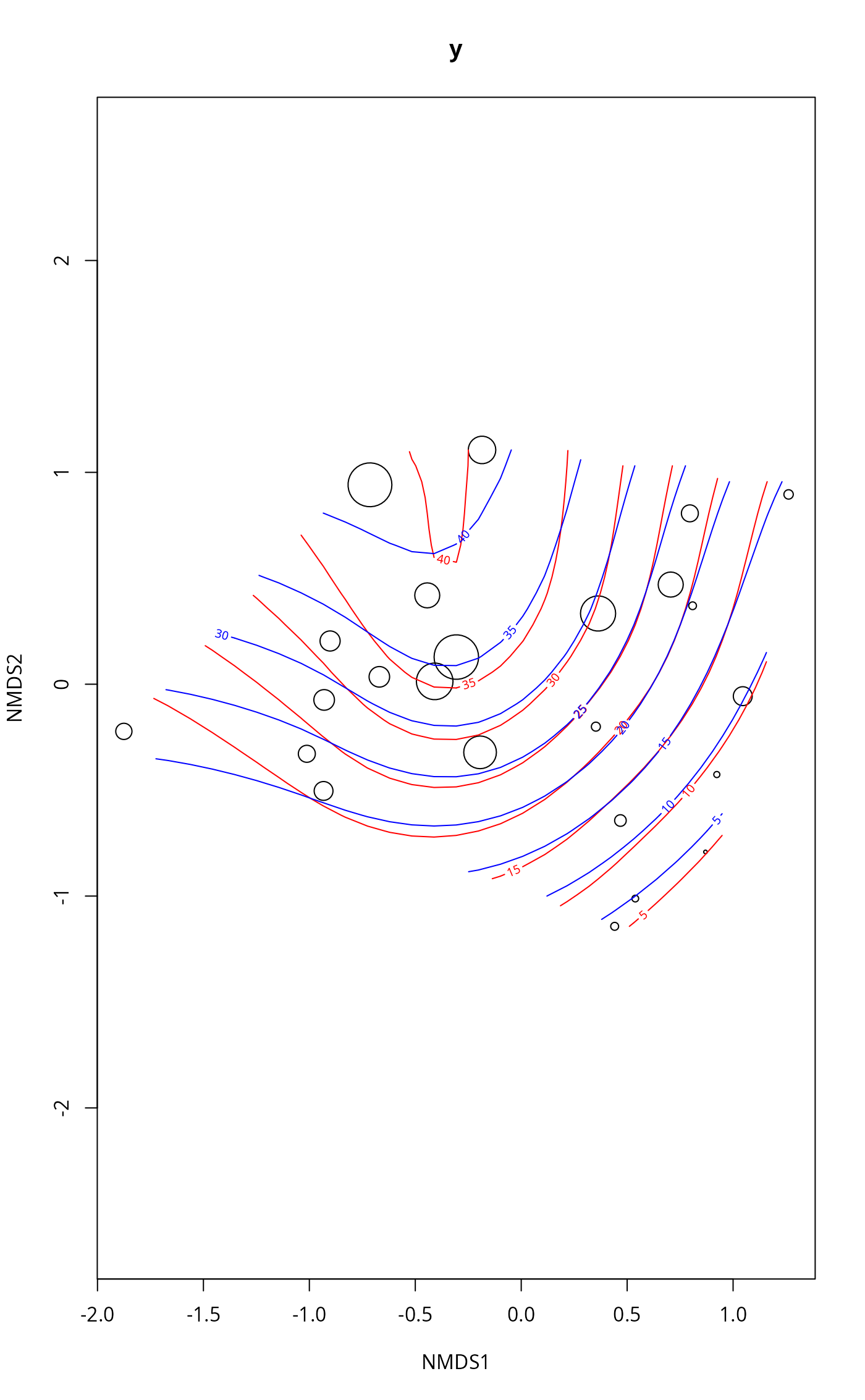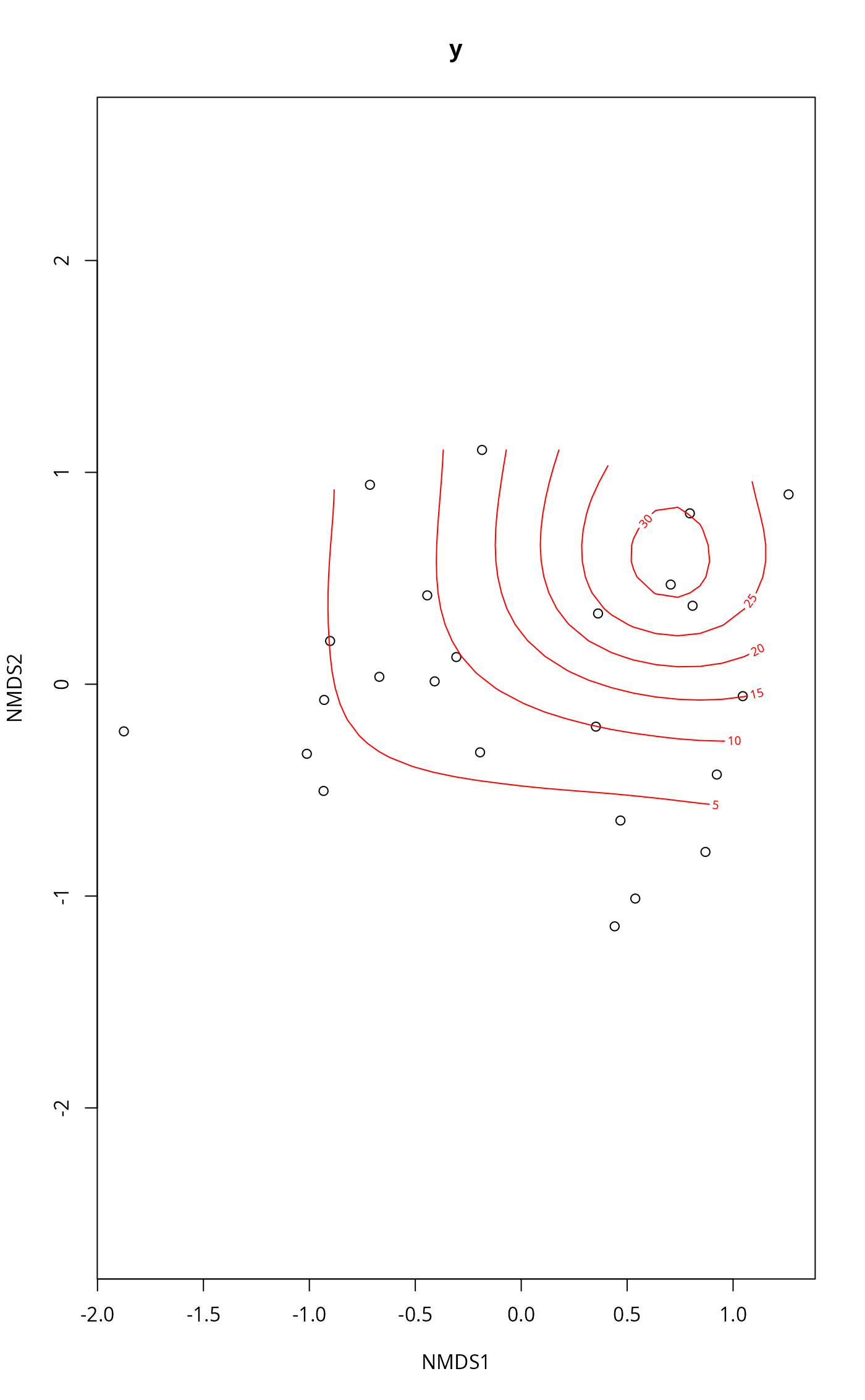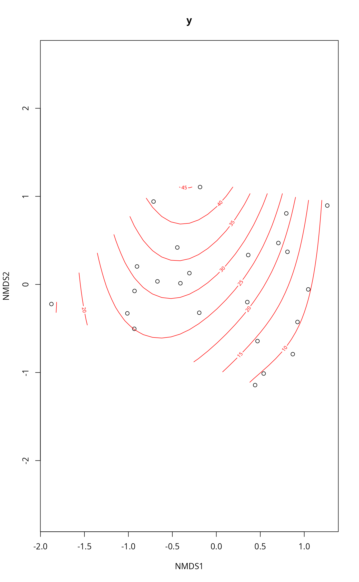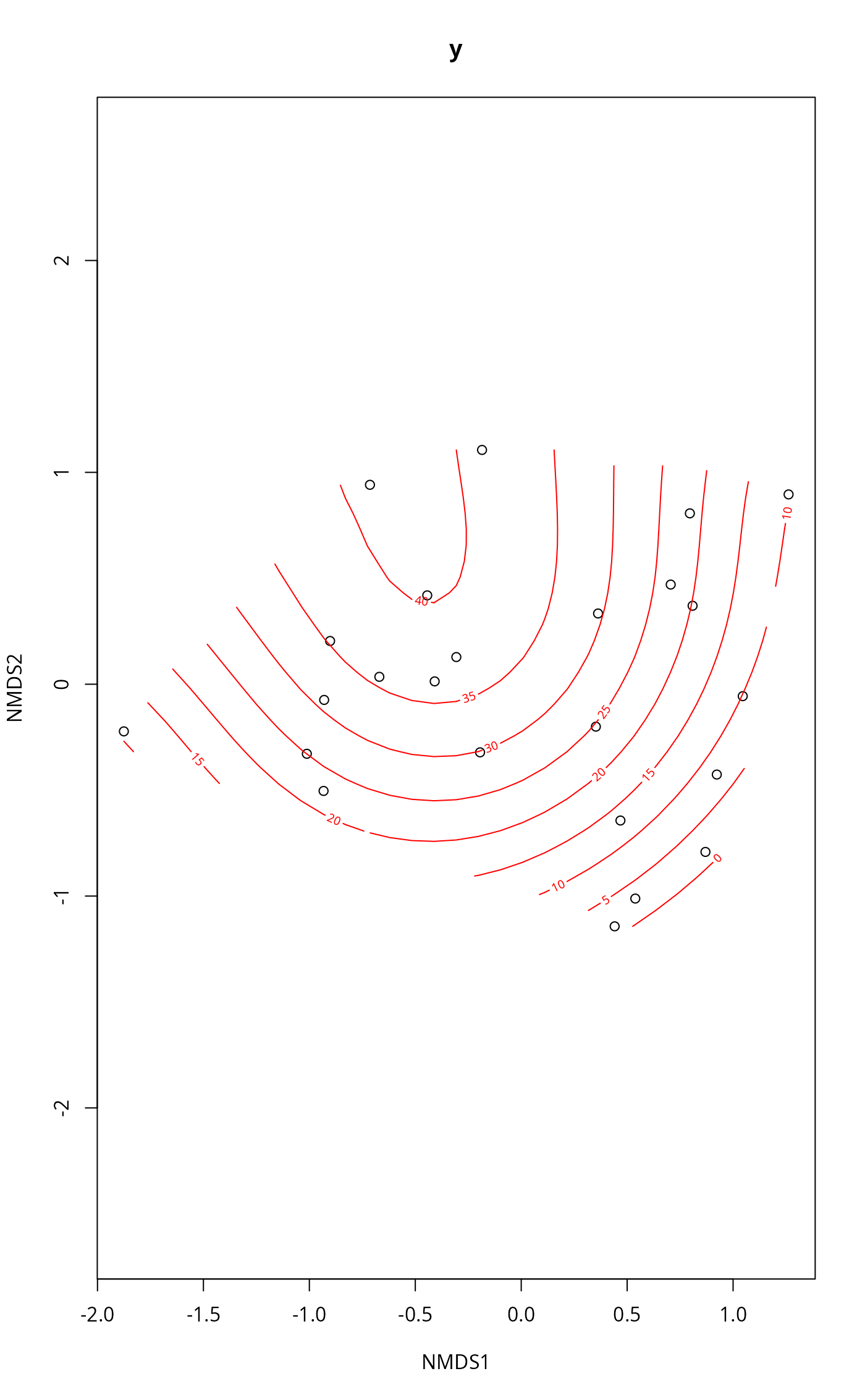 ordisurf(x, y, choices = c(1, 2), knots = 10,