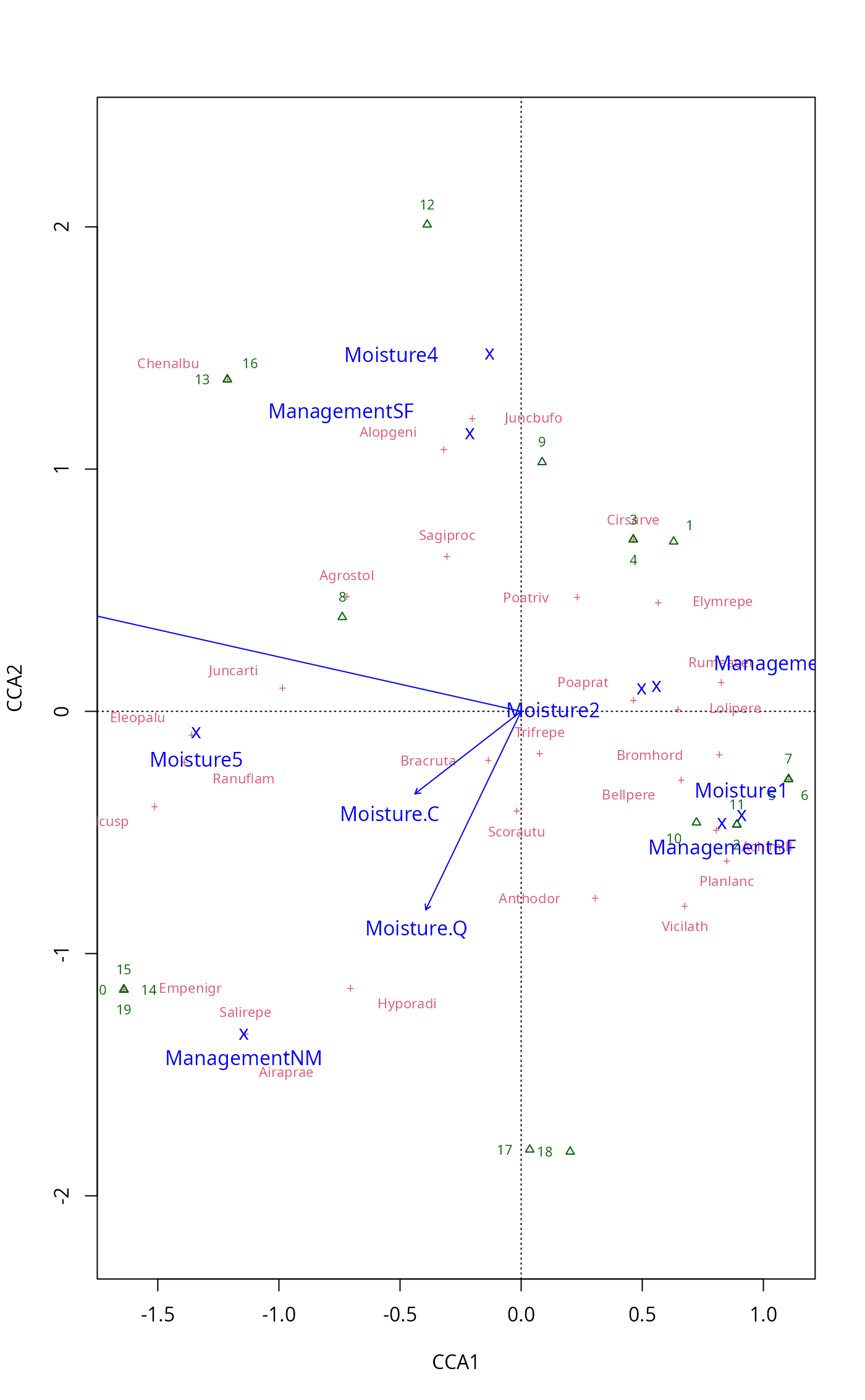 mod <- cca(dune ~ Moisture + Management, dune.env)