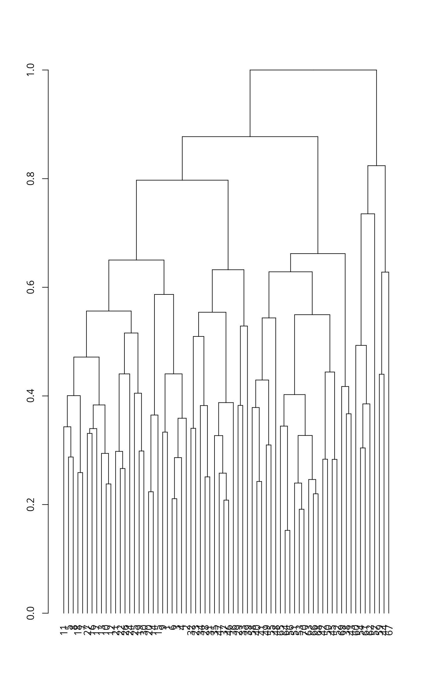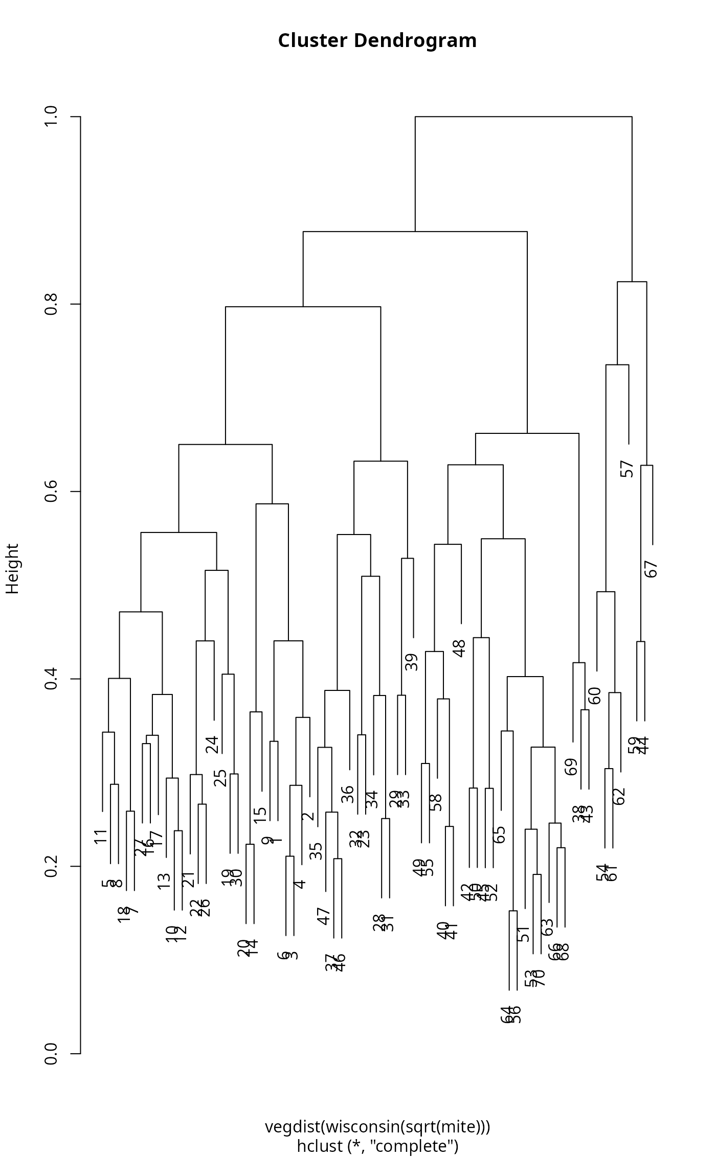 hc <- hclust(vegdist(wisconsin(sqrt(mite))))