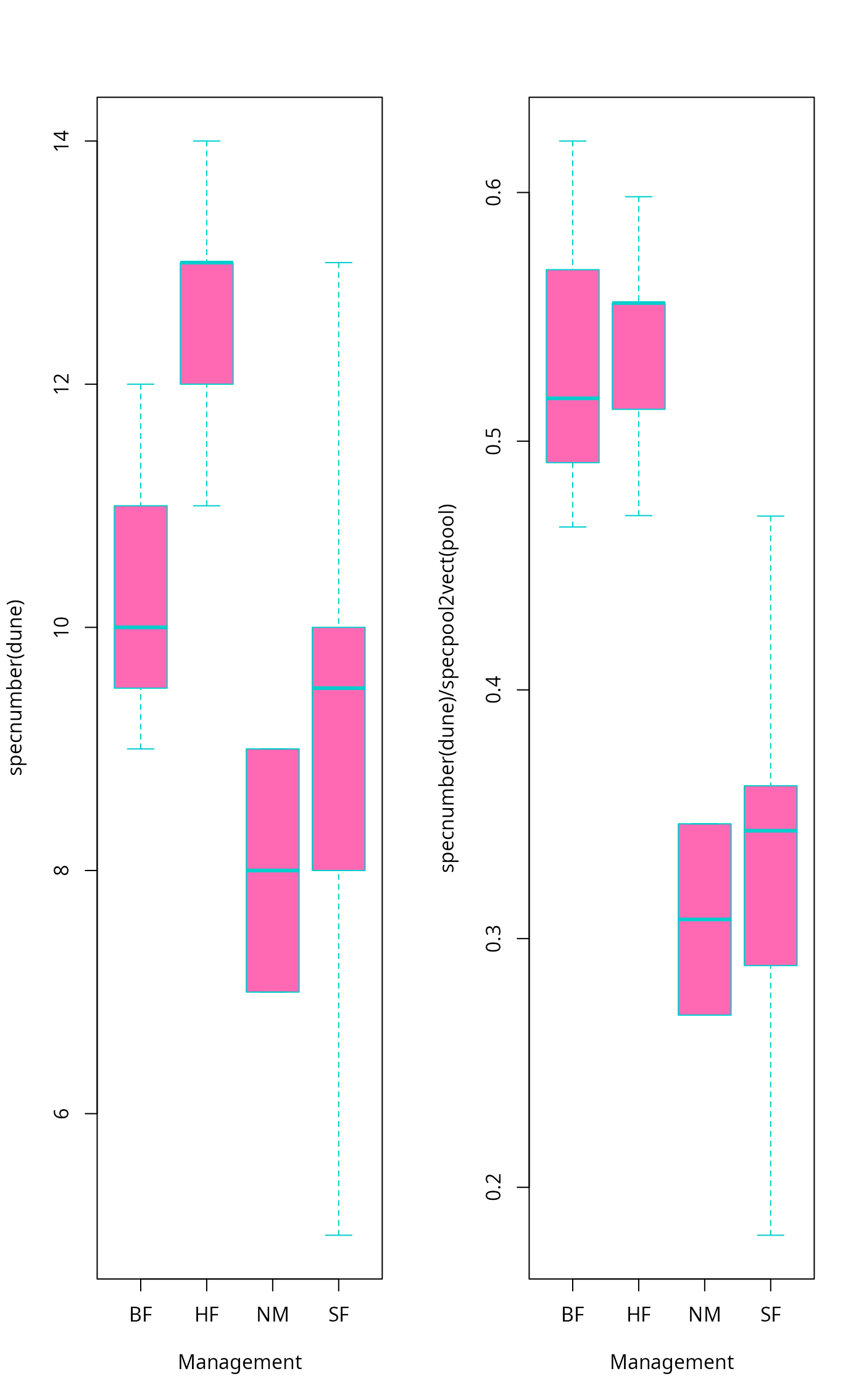 boxplot(specnumber(dune) ~ Management, data = dune.env,