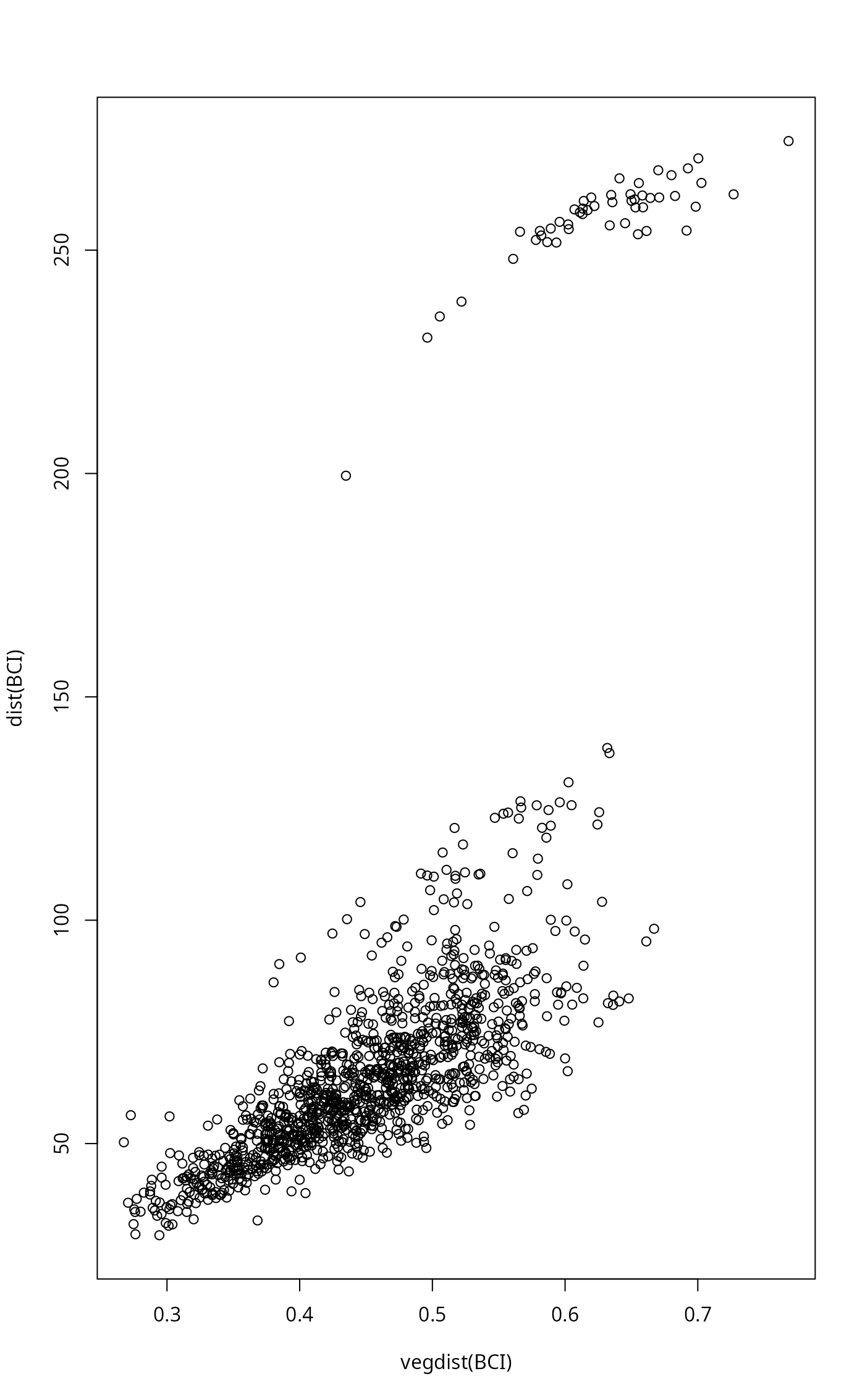 plot(vegdist(BCI), dist(sqrt(decostand(BCI, "total"))))