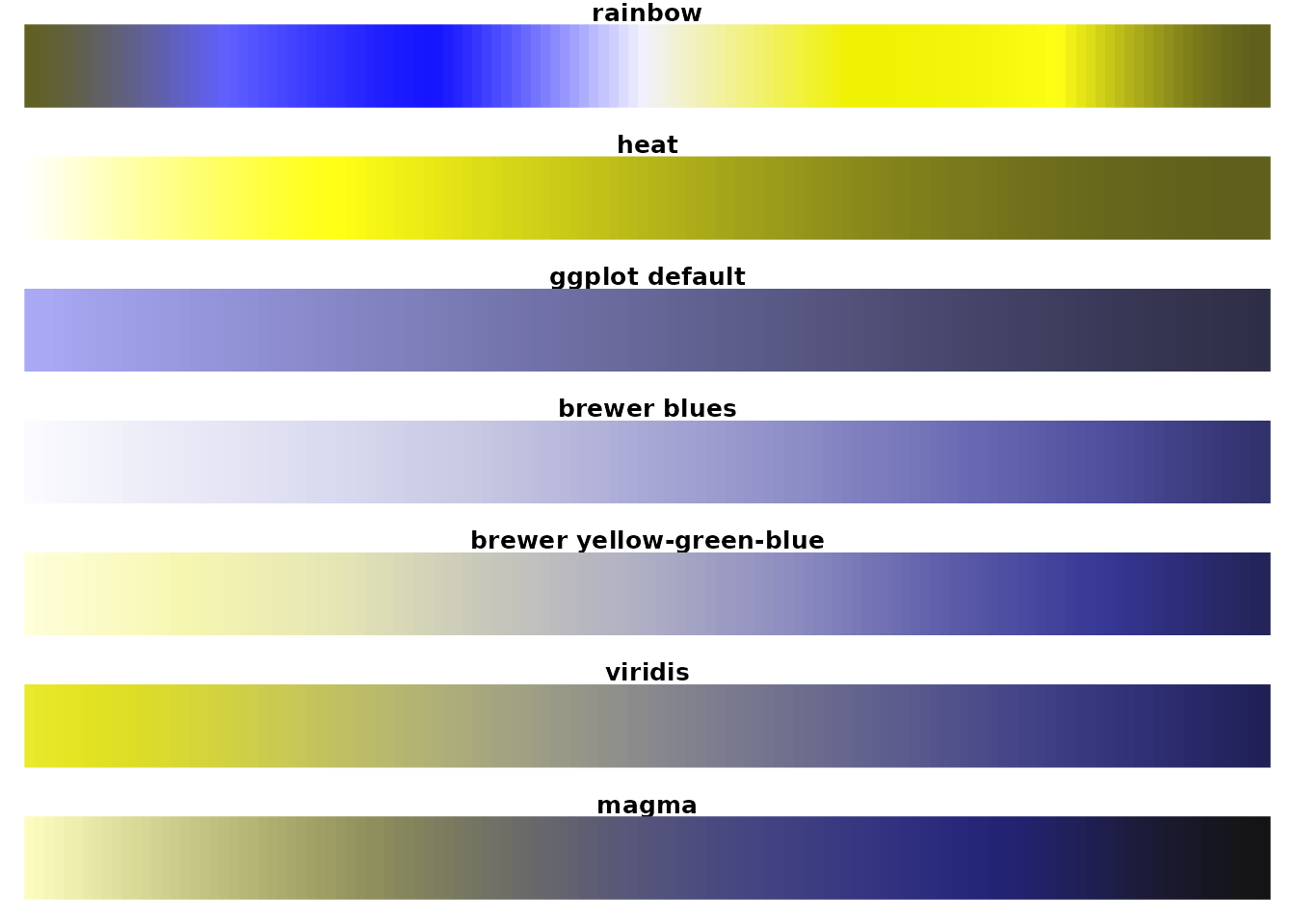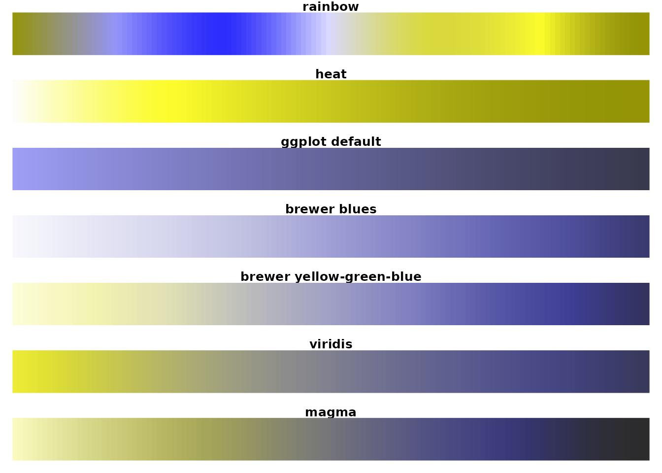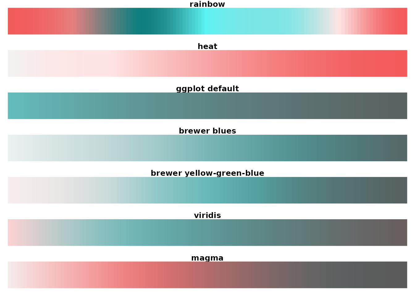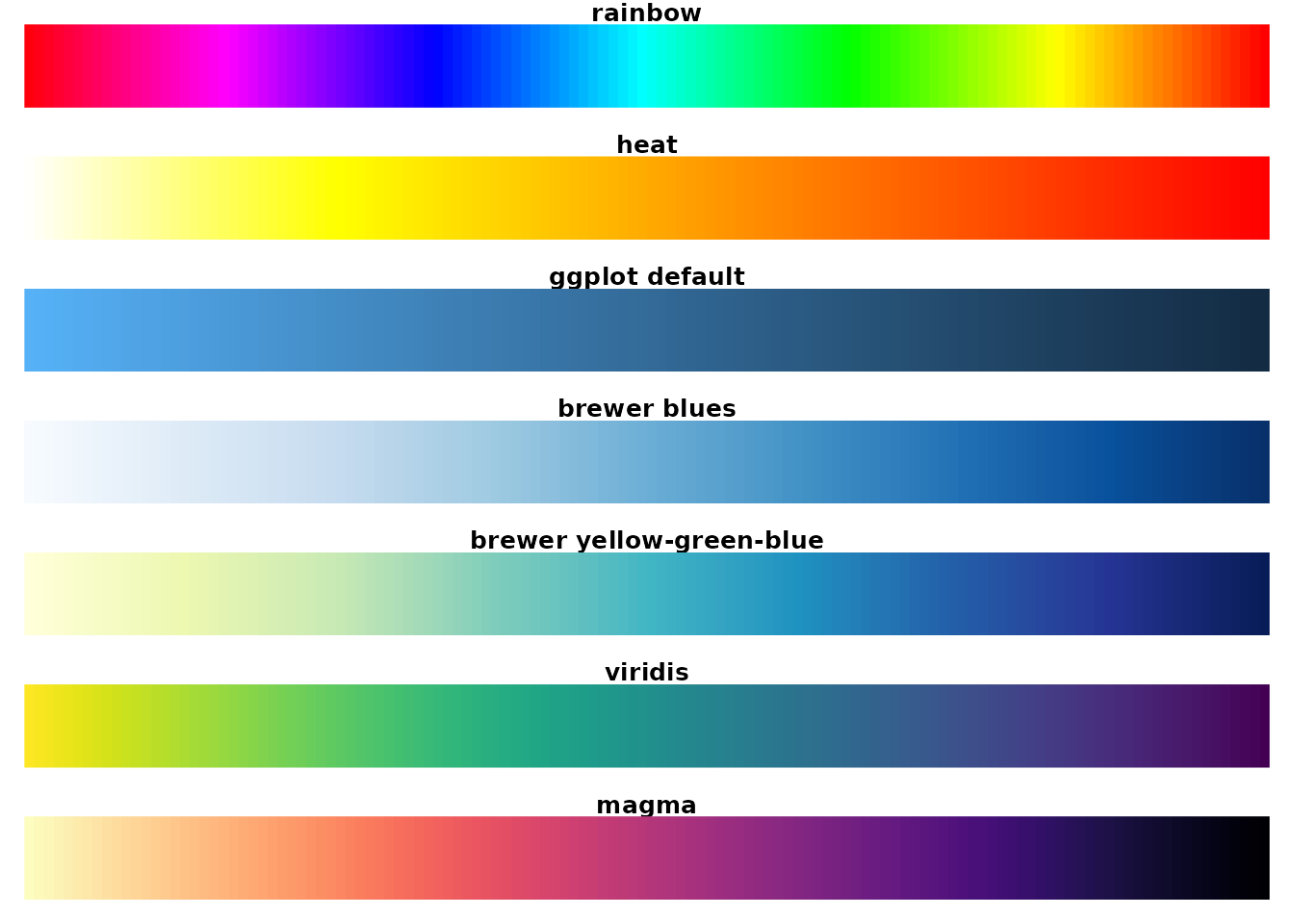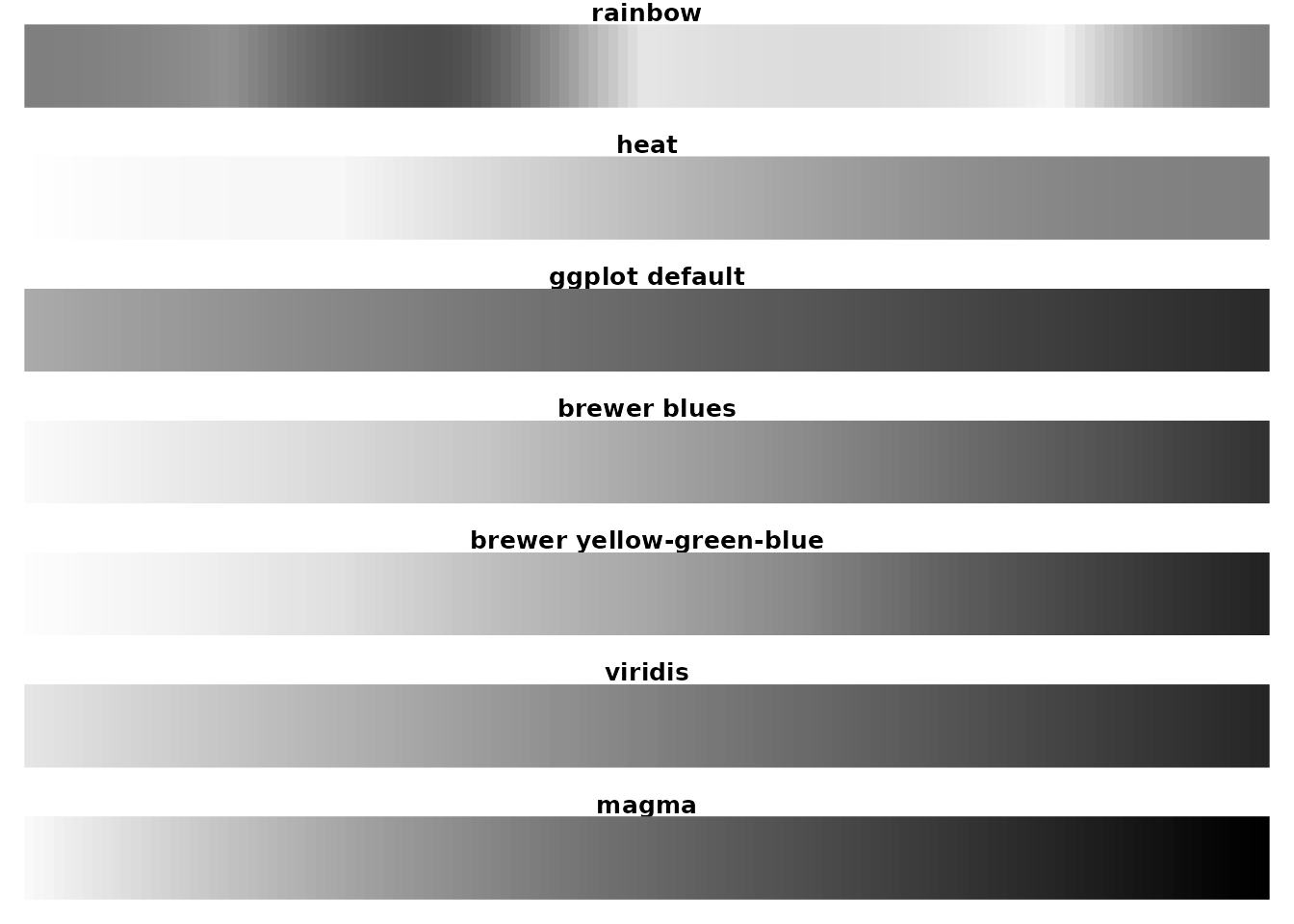 Let’s compare the viridis and magma scales against these other commonly used sequential color palettes in R: