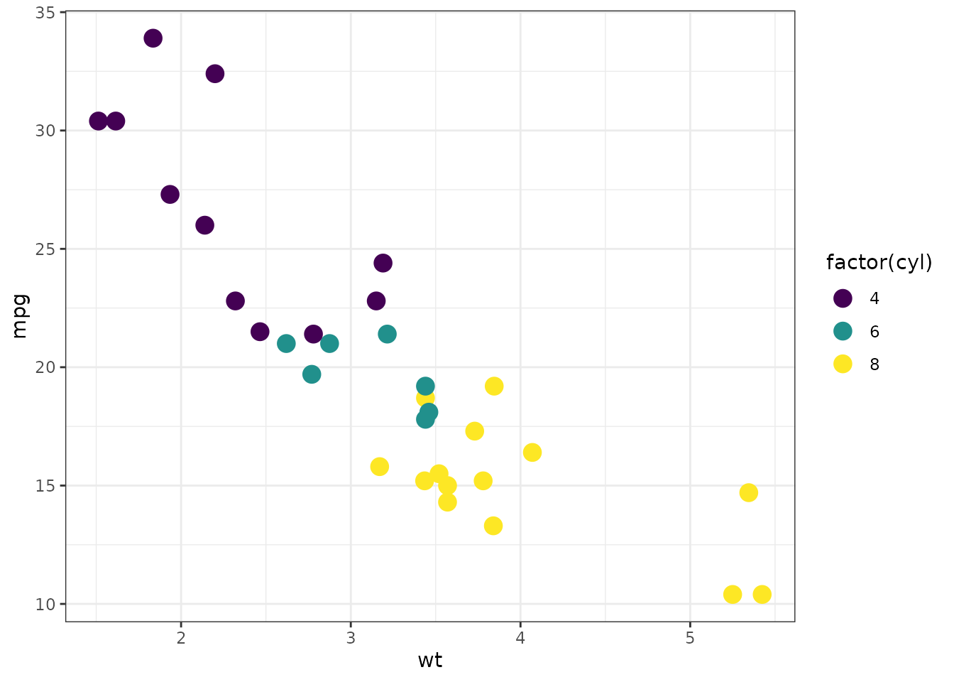 p + geom_point(size=4, aes(colour = factor(cyl))) +