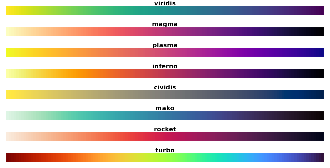 The package contains eight color scales: “viridis”, the primary choice, and five alternatives with similar properties - “magma”, “plasma”, “inferno”, “civids”, “mako”, and “rocket” -, and a rainbow color map - “turbo”.