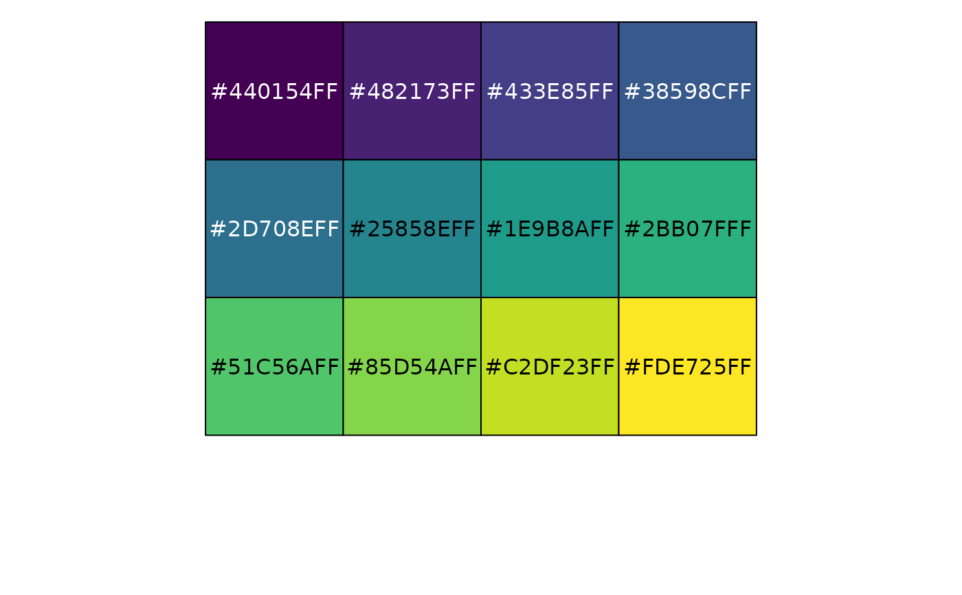 viridis_pal(alpha = 1, begin = 0, end = 1, direction = 1, option = "D")The alpha transparency, a number in [0,1], see argument alpha in