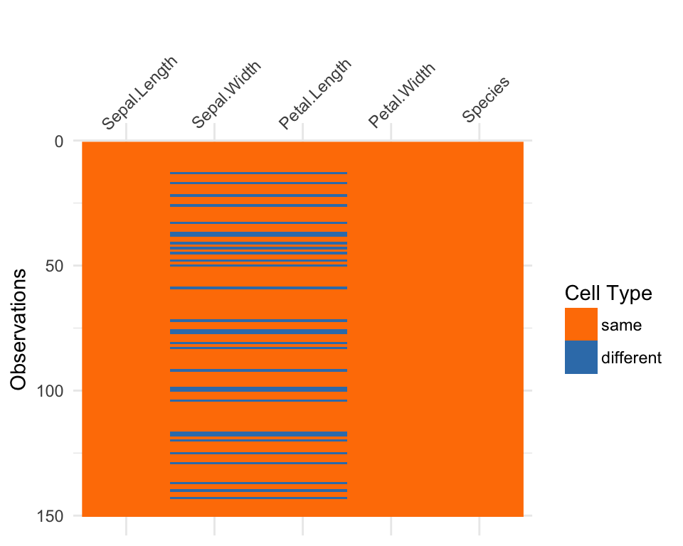 #> vis_compare is still in BETA! If you have suggestions or errors, post an issue at https://github.com/njtierney/visdat/issuesthe condition has length > 1 and only the first element will be usedError: `.x` (5) and `.y` (6) are different lengthsIn the future I’m hoping to create some way of representing the added columns and rows as an additional facet-like part of the plot, perhaps using something from gridExtra.