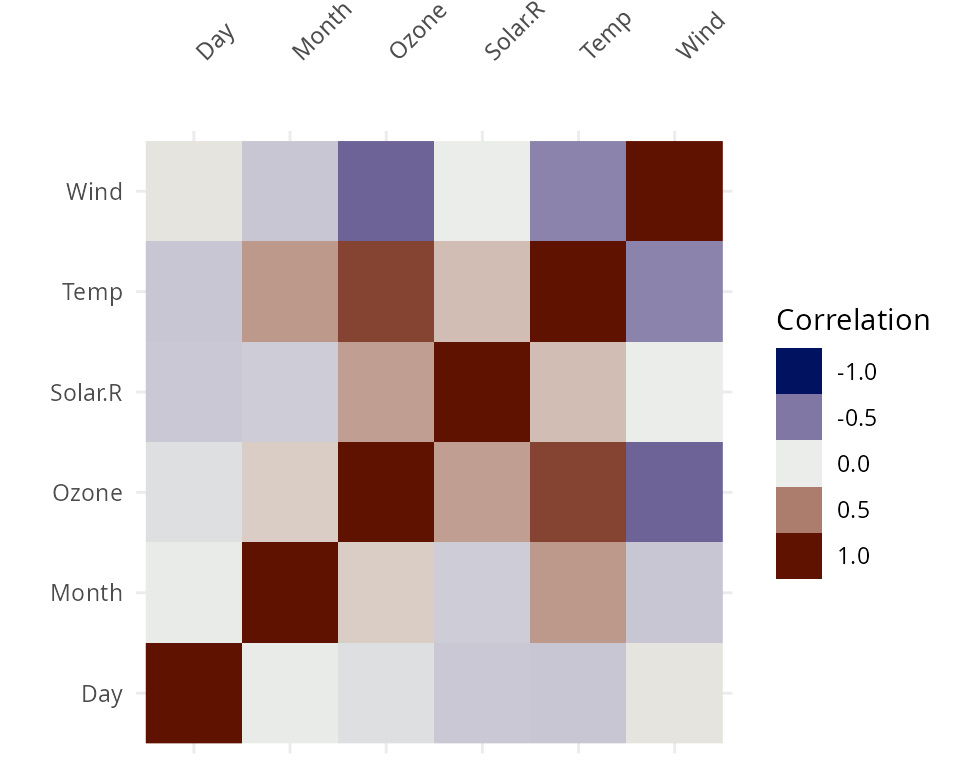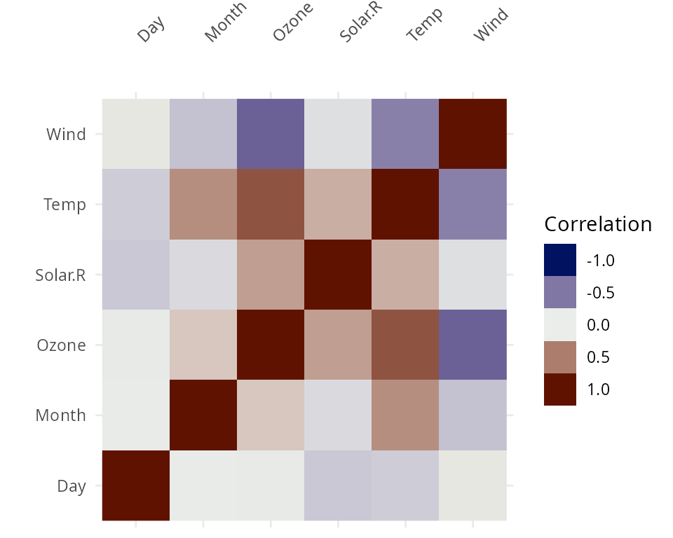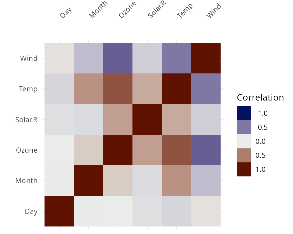 vis_cor(airquality, cor_method = "spearman")