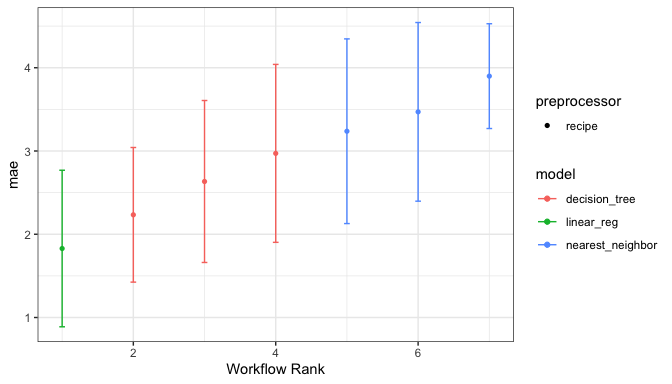 The autoplot() method shows the rankings of the workflows: