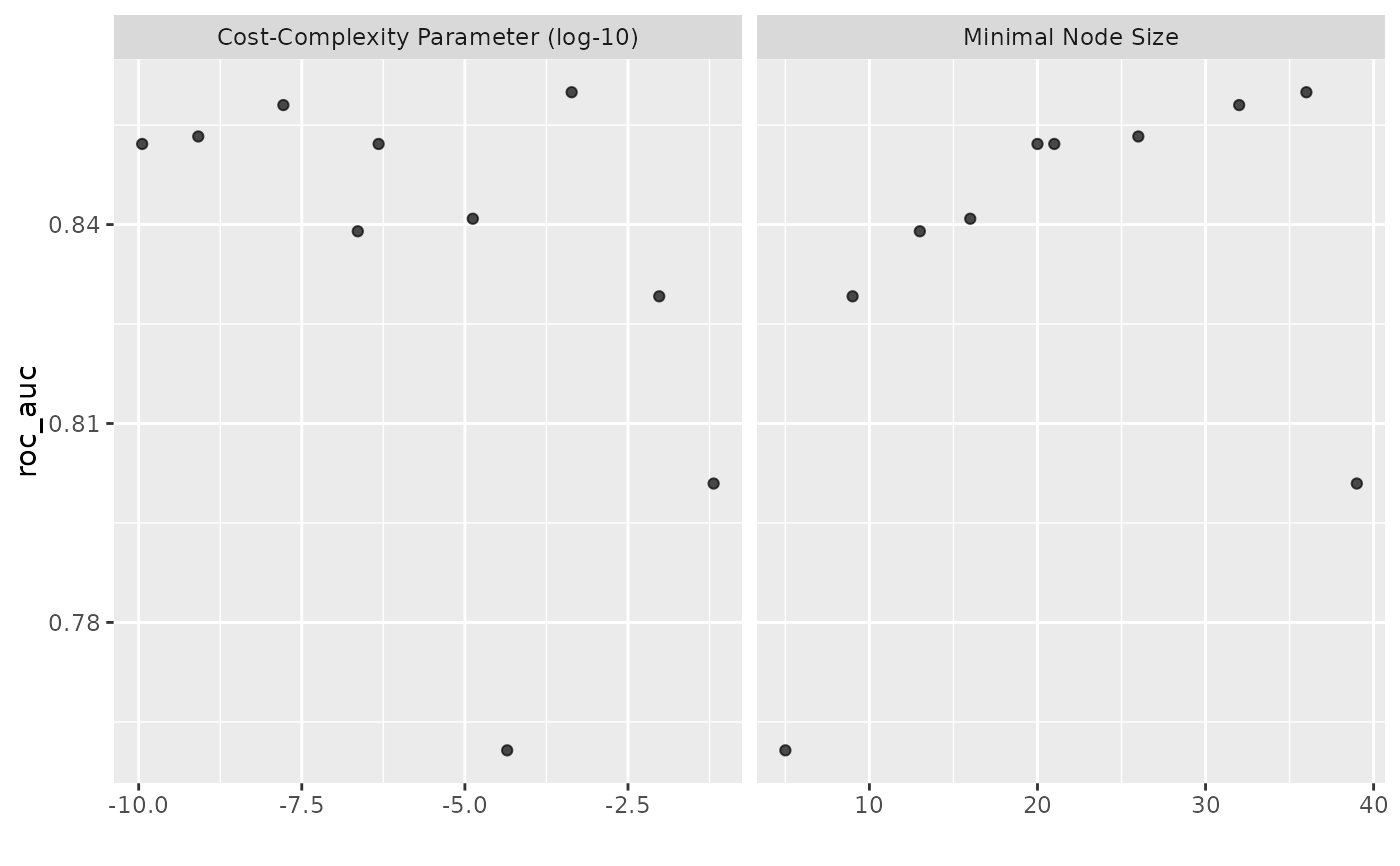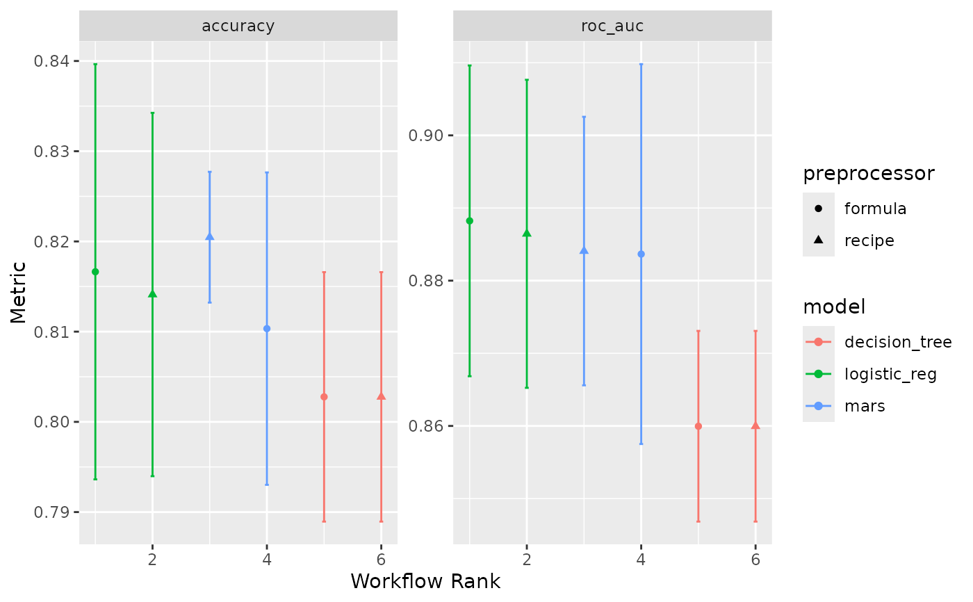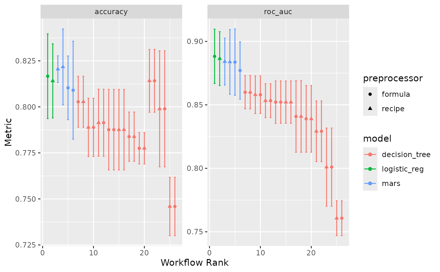 The x-axis is the workflow rank in the set (a value of one being the best) versus the performance metric(s) on the y-axis. With multiple metrics, there will be facets for each metric.
