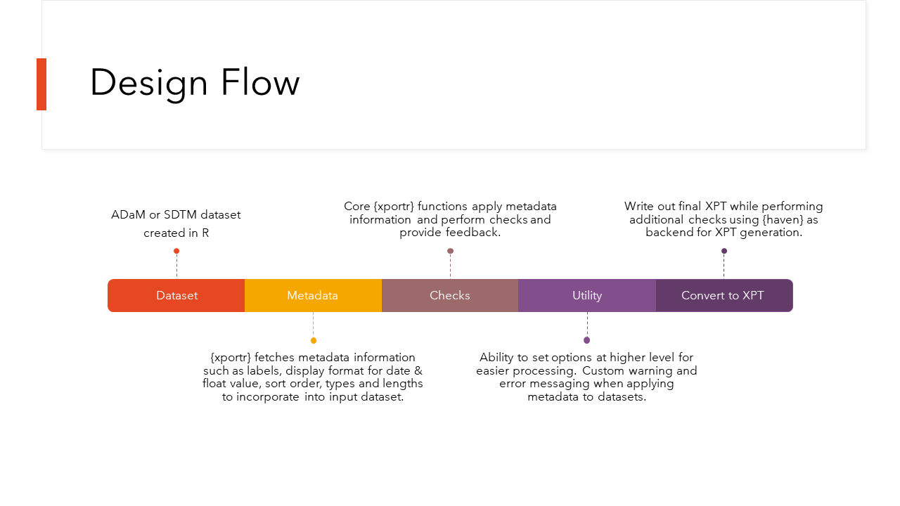 The first set of tools are designed to allow a clinical programmer to build a CDISC compliant xpt file directly from R. The second set of tools are to perform checks on your data sets before you send them off to any validators or data reviewers.