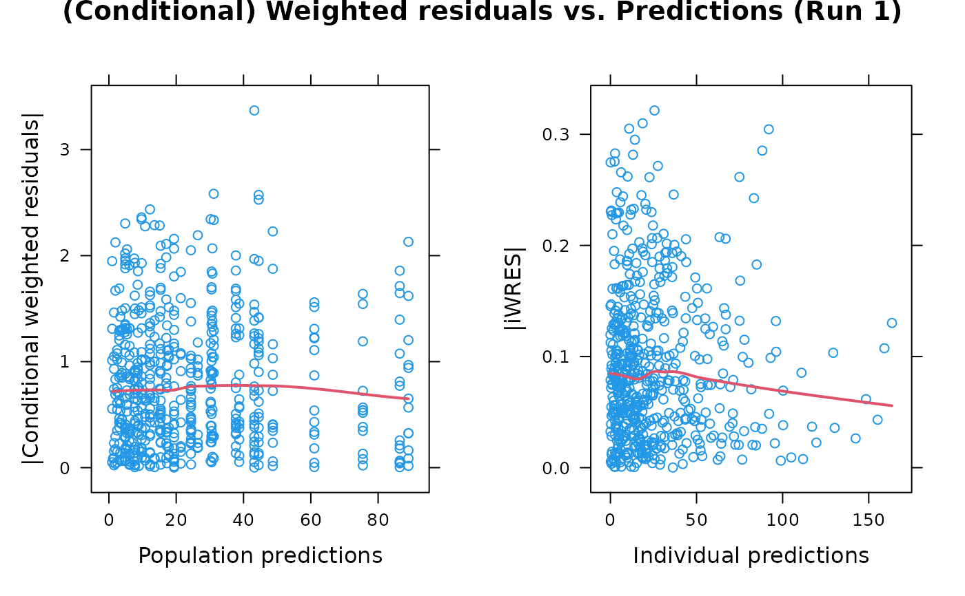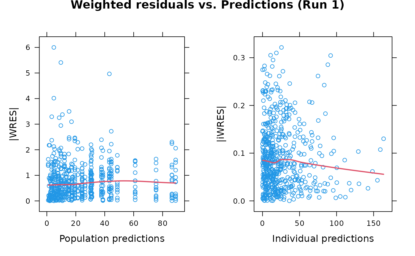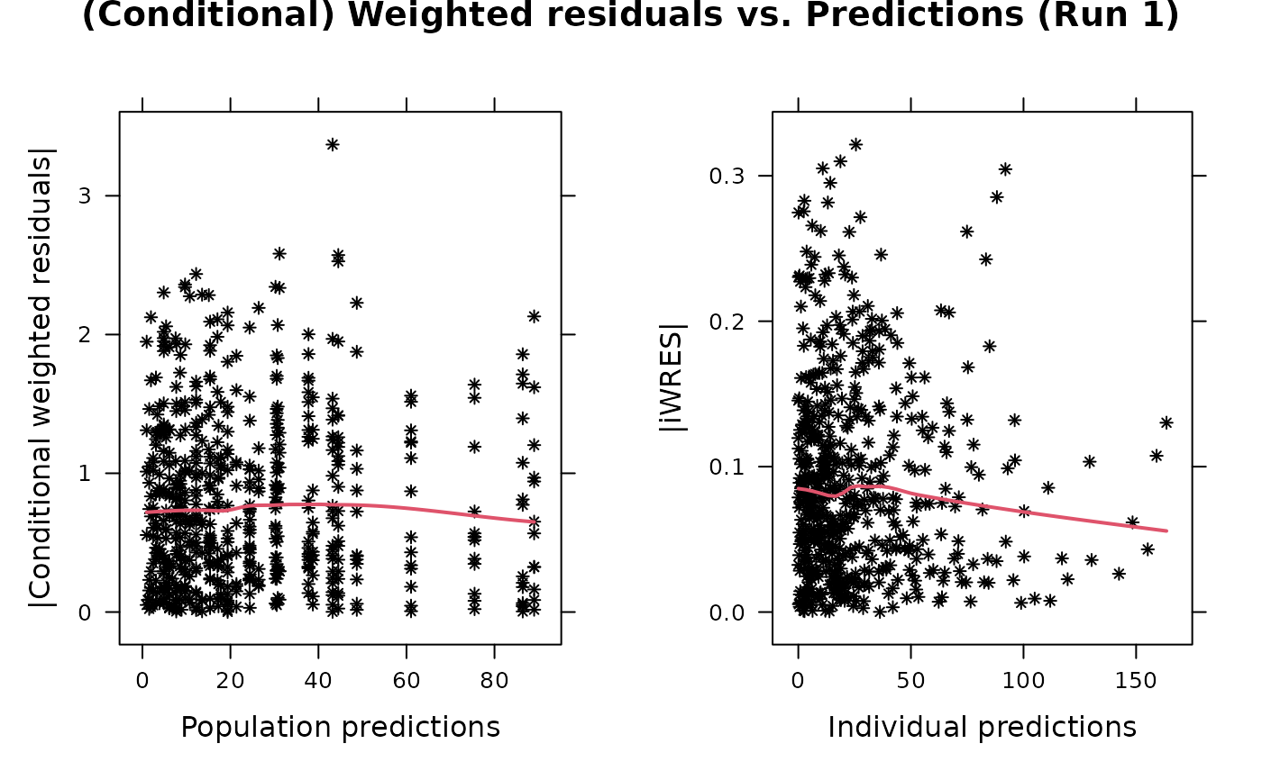 absval.iwres.wres.vs.ipred.pred(): absolute population weighted residuals (|WRES|) vs