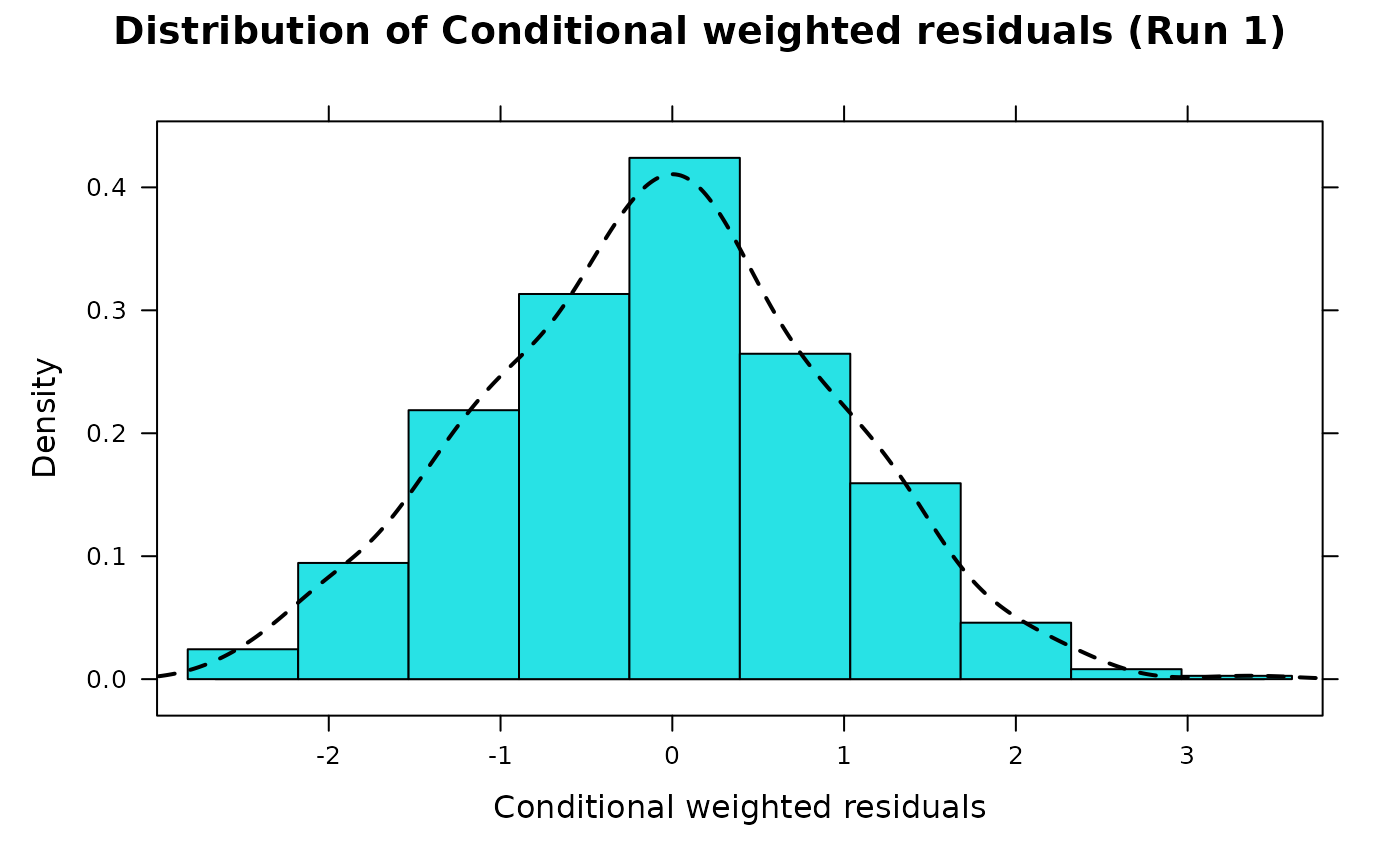 Displays a histogram of the conditional weighted residuals (CWRES).