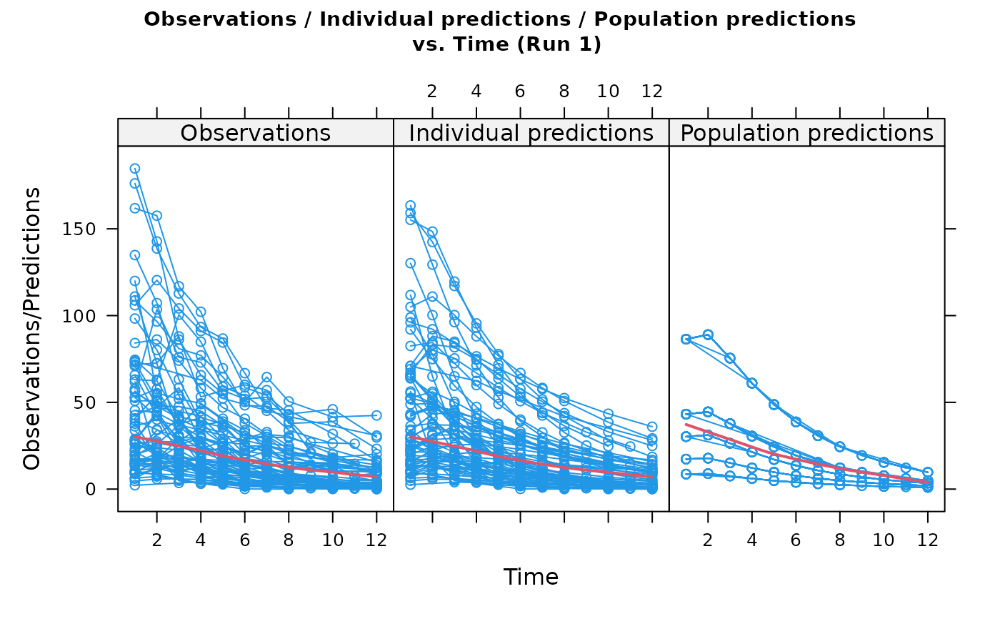 Returns a compound plot comprising plots of observations (DV), individual predictions (IPRED), and population predictions (PRED) against the independent variable (IDV).