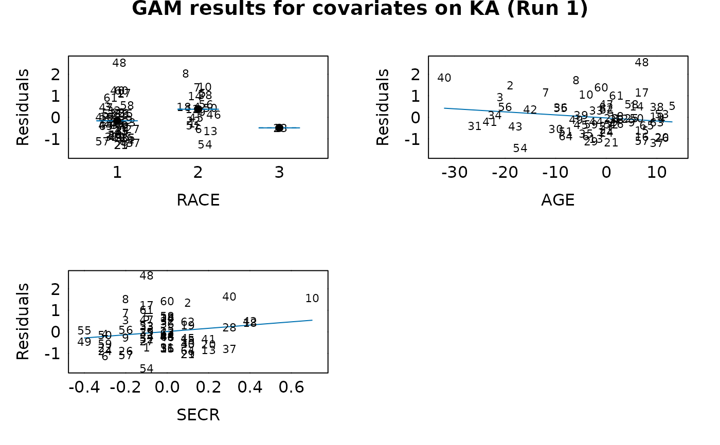 #> Call: gam(formula = KA ~ RACE + AGE + SECR, data = gamdata, trace = FALSE)