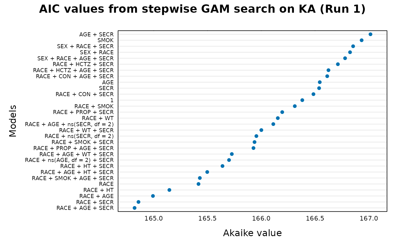 #> Step:2 KA ~ RACE + SECR ; AIC= 164.8582